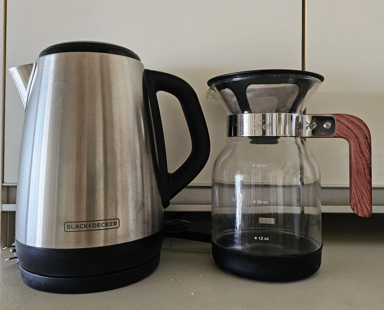 Stainless steel electric kettle with a black base. Glass coffee maker with a wooden handle. Preparing a lovely cup of coffee is a relaxing way to start your day. Only used once.