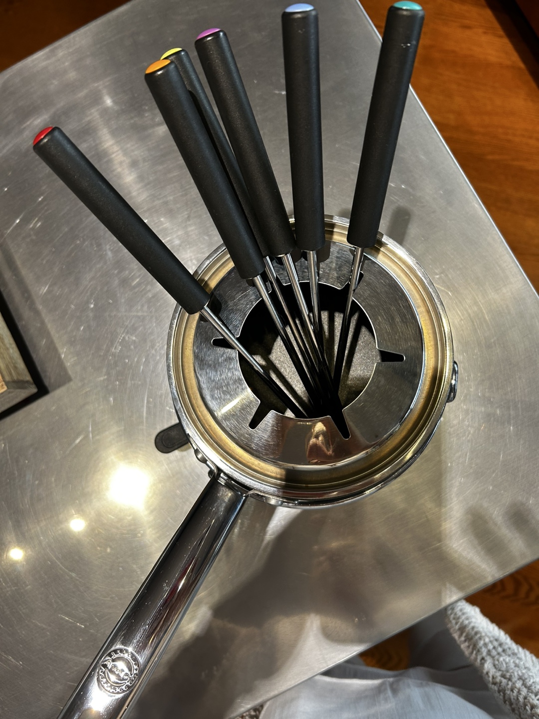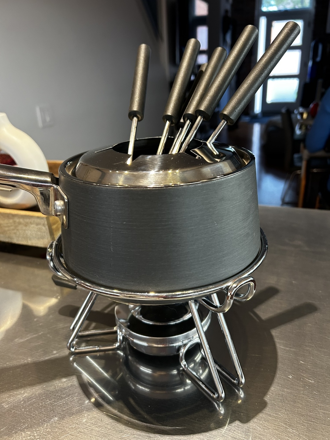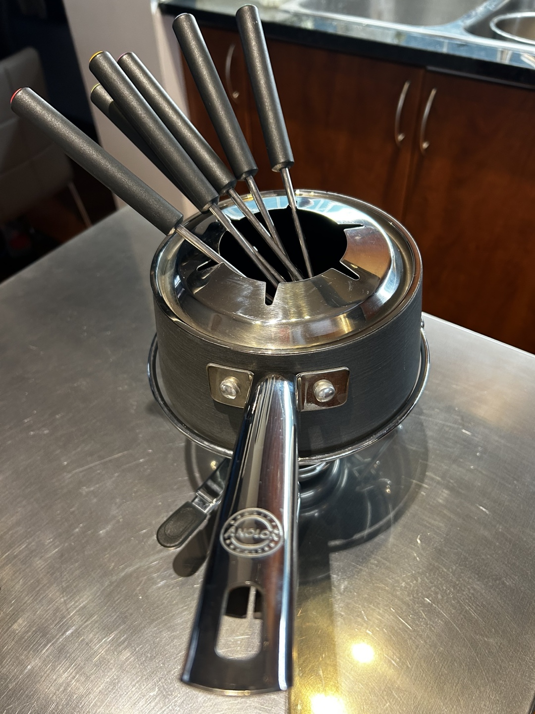 A fondue set, complete with forks. Stainless steel pot with stand. A relaxing set to enjoy with friends and family.