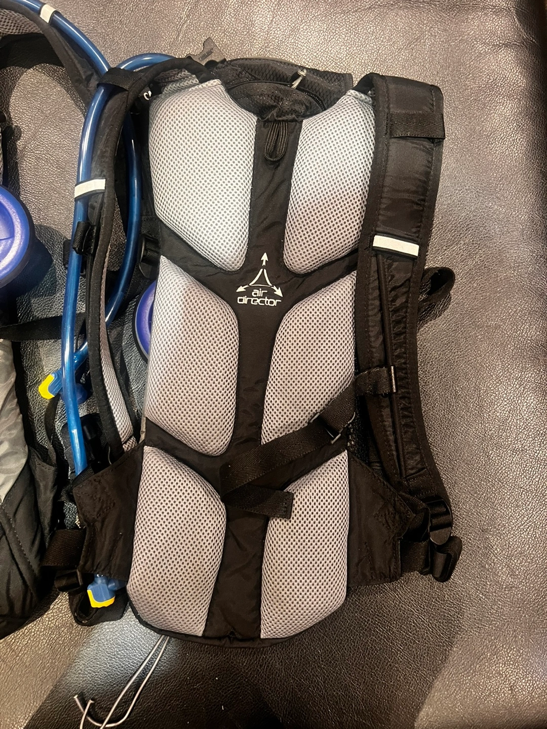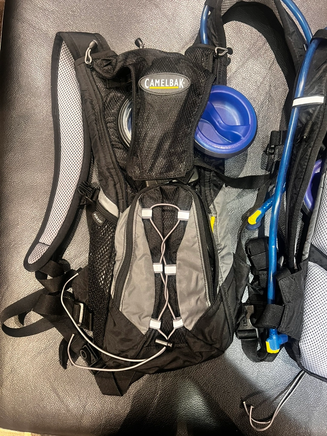 Hydration pack in black and grey. Features mesh back panel and adjustable straps. Hydration tube and reservoir holder included. A great item to bring on hikes to make sure you stay hydrated. $45