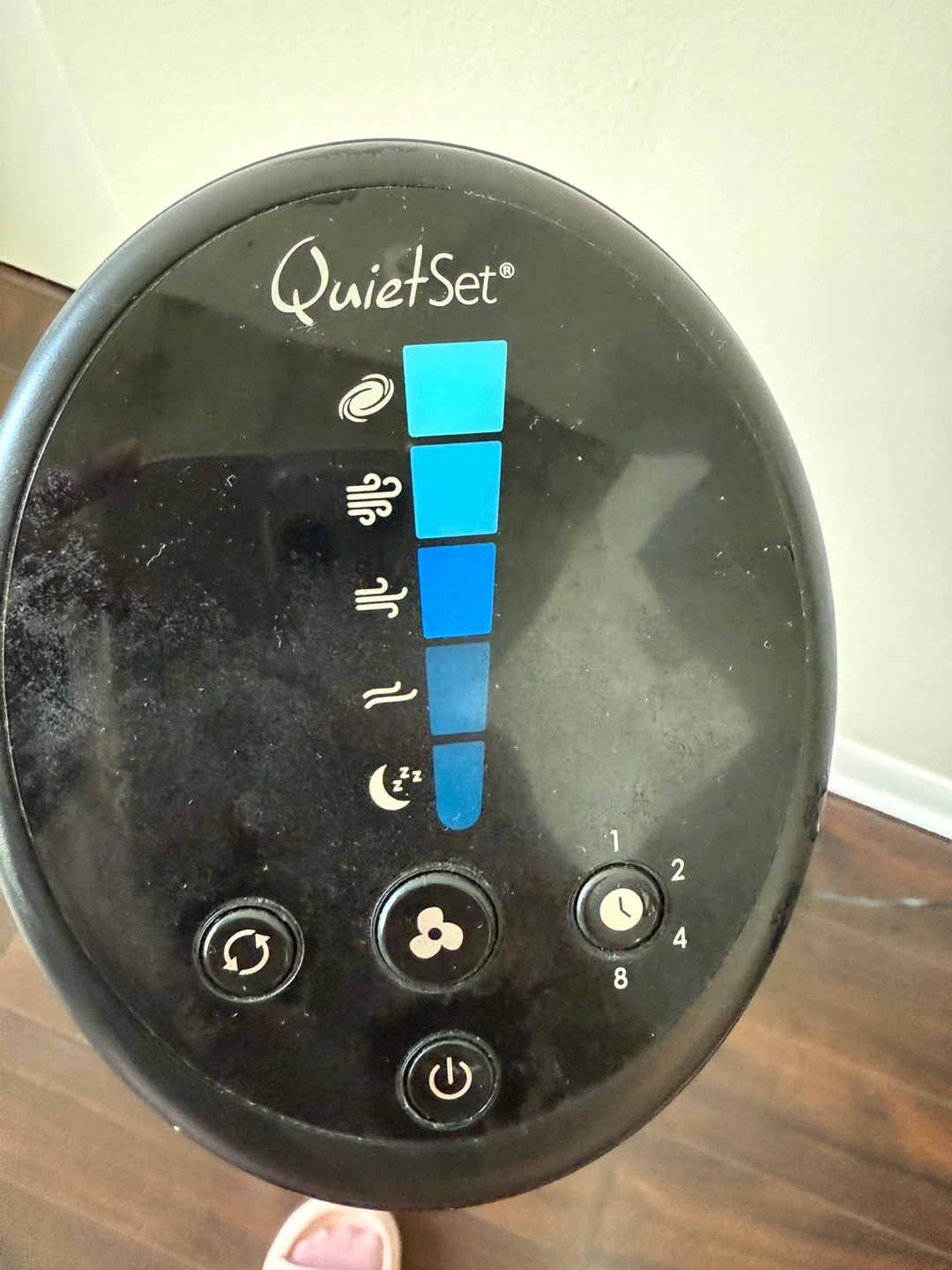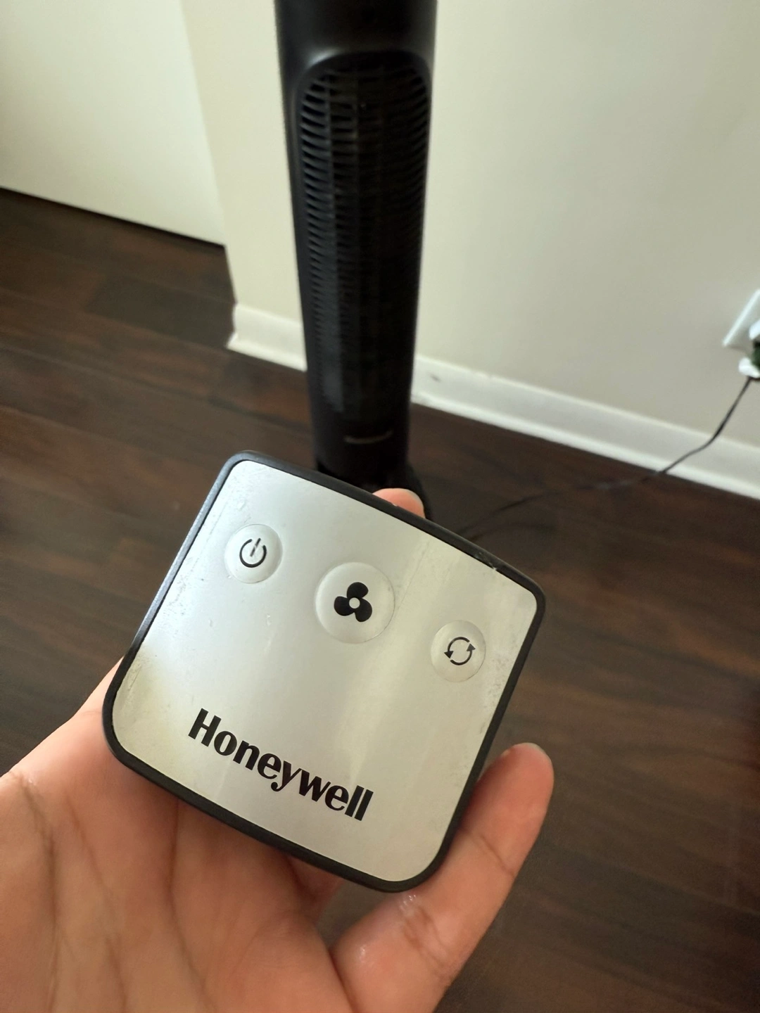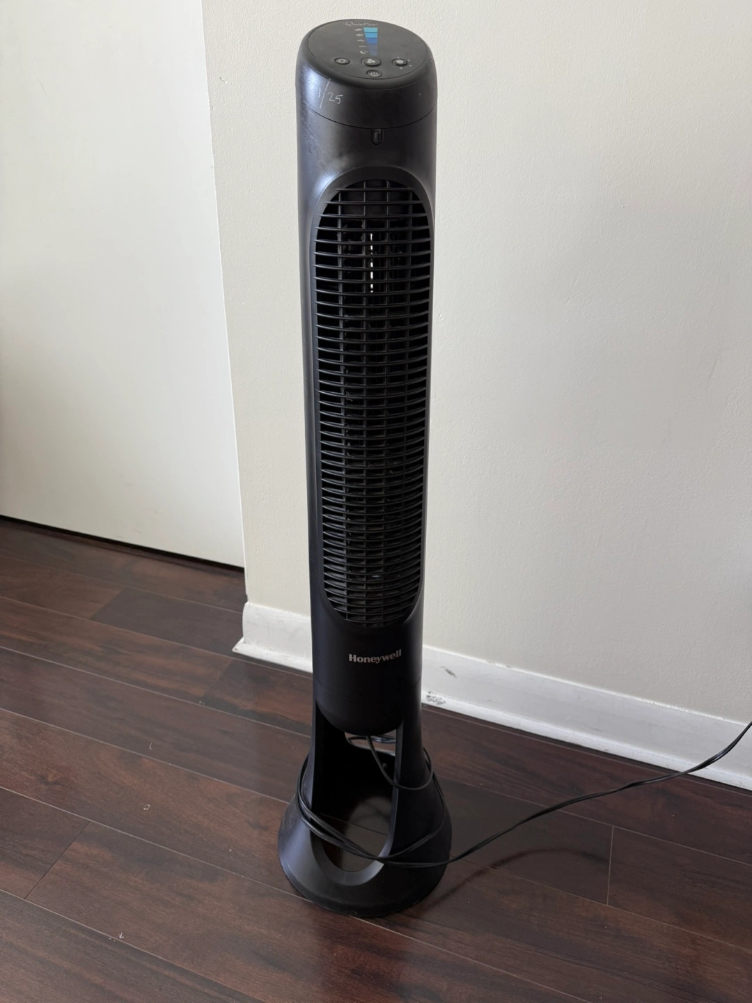 Black tower fan. Features multiple settings. Comes with a remote control. This fan offers a cool breeze on a hot day to give a sense of serenity.