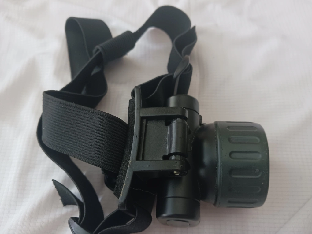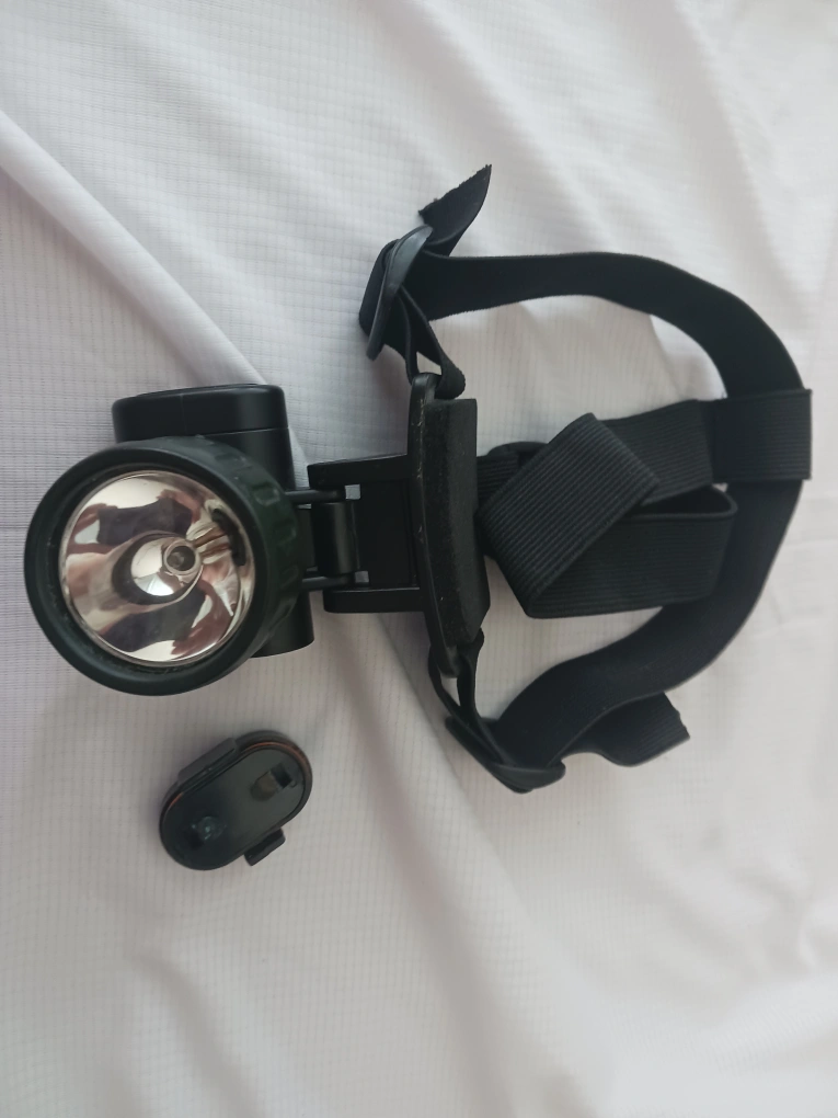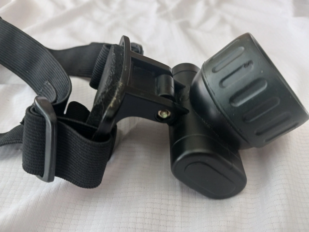 An adjustable headlamp. Includes an adjustable strap. With the wider strap and padding for the forehead, it is much more comfortable to use. The light component is much larger than most sold today, making visibility greater. A wonderful tool for camping at night, caving, working under your car hood, etc.