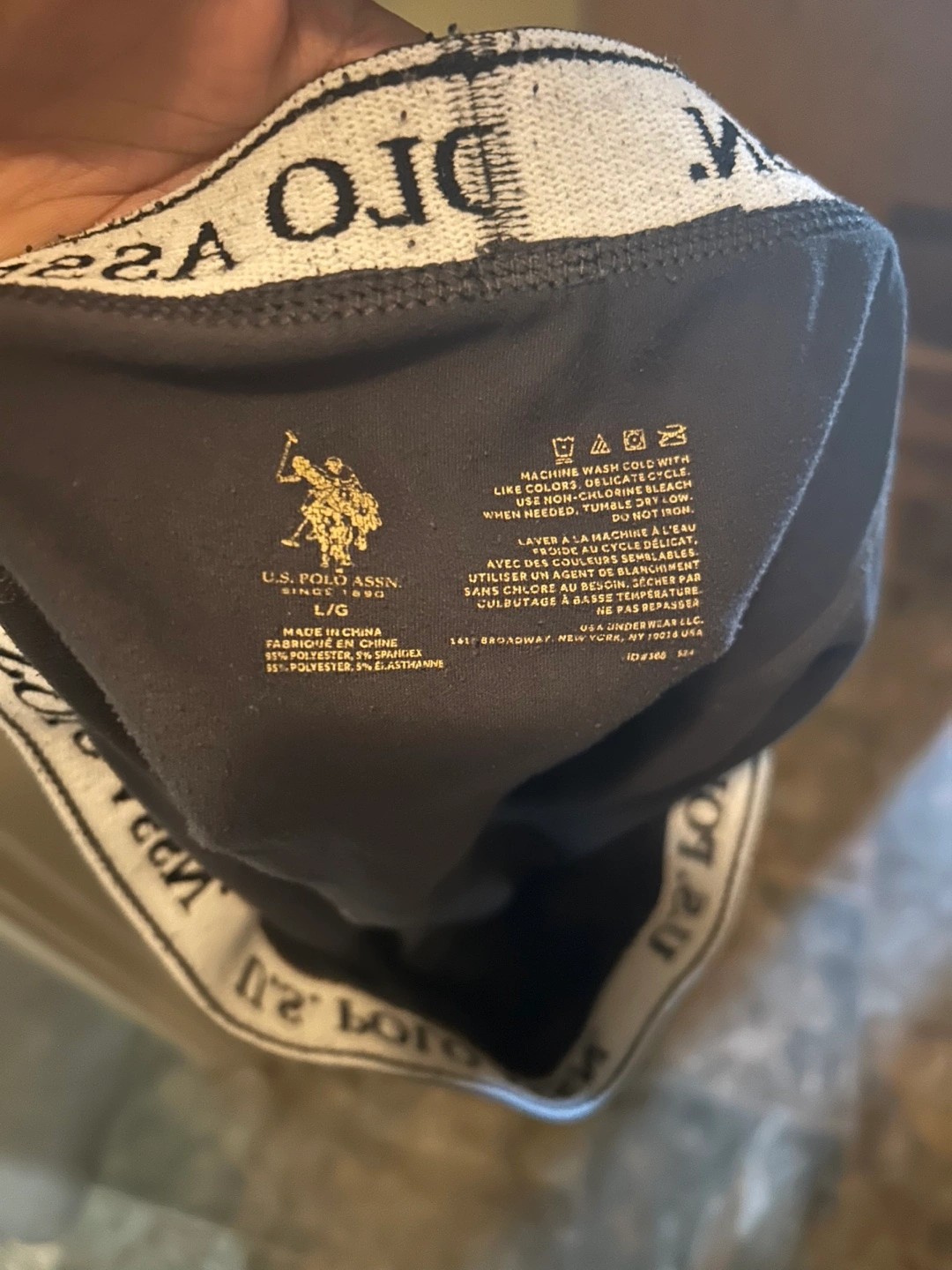 Black boxer briefs. Features a waistband with U.S. POLO ASSN. written across. The material is made of polyester and spandex. I hope you like them, enjoy the comfort they offer.
