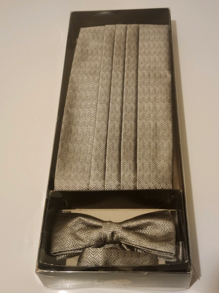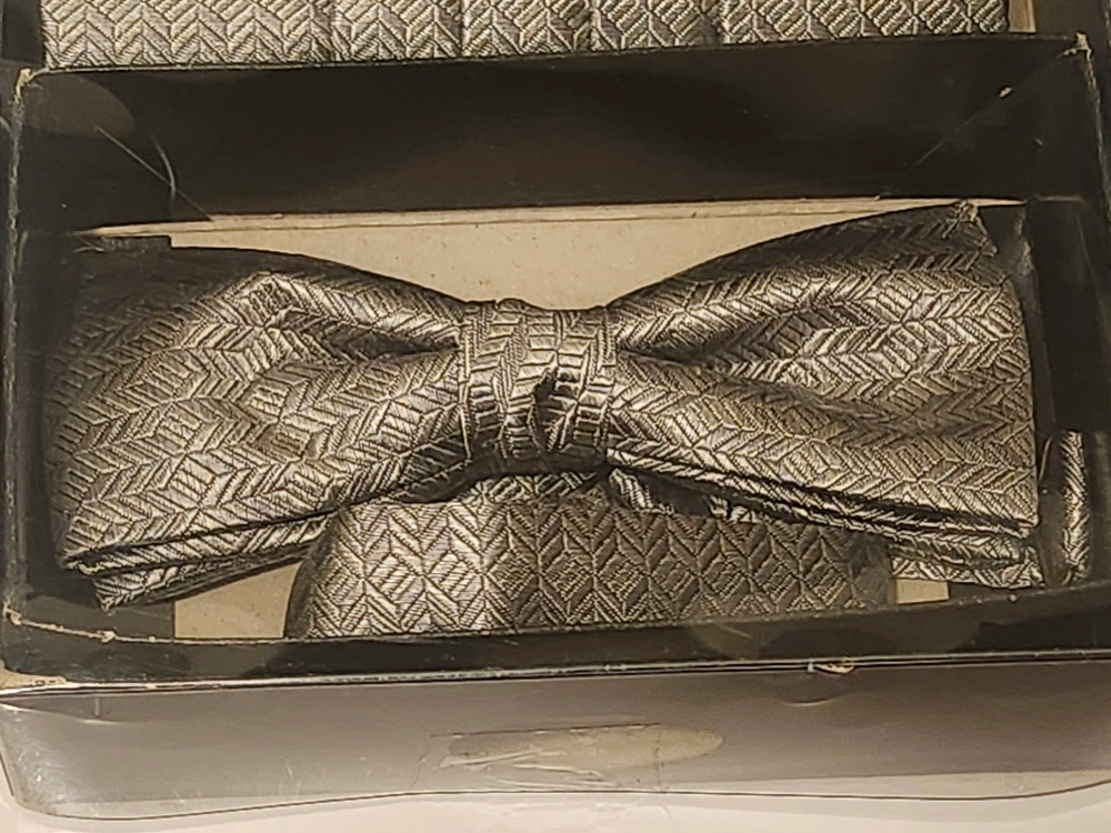A beautiful tie and bow-tie set, still in its original packaging. I bet this would look great at a wedding, or any formal event.