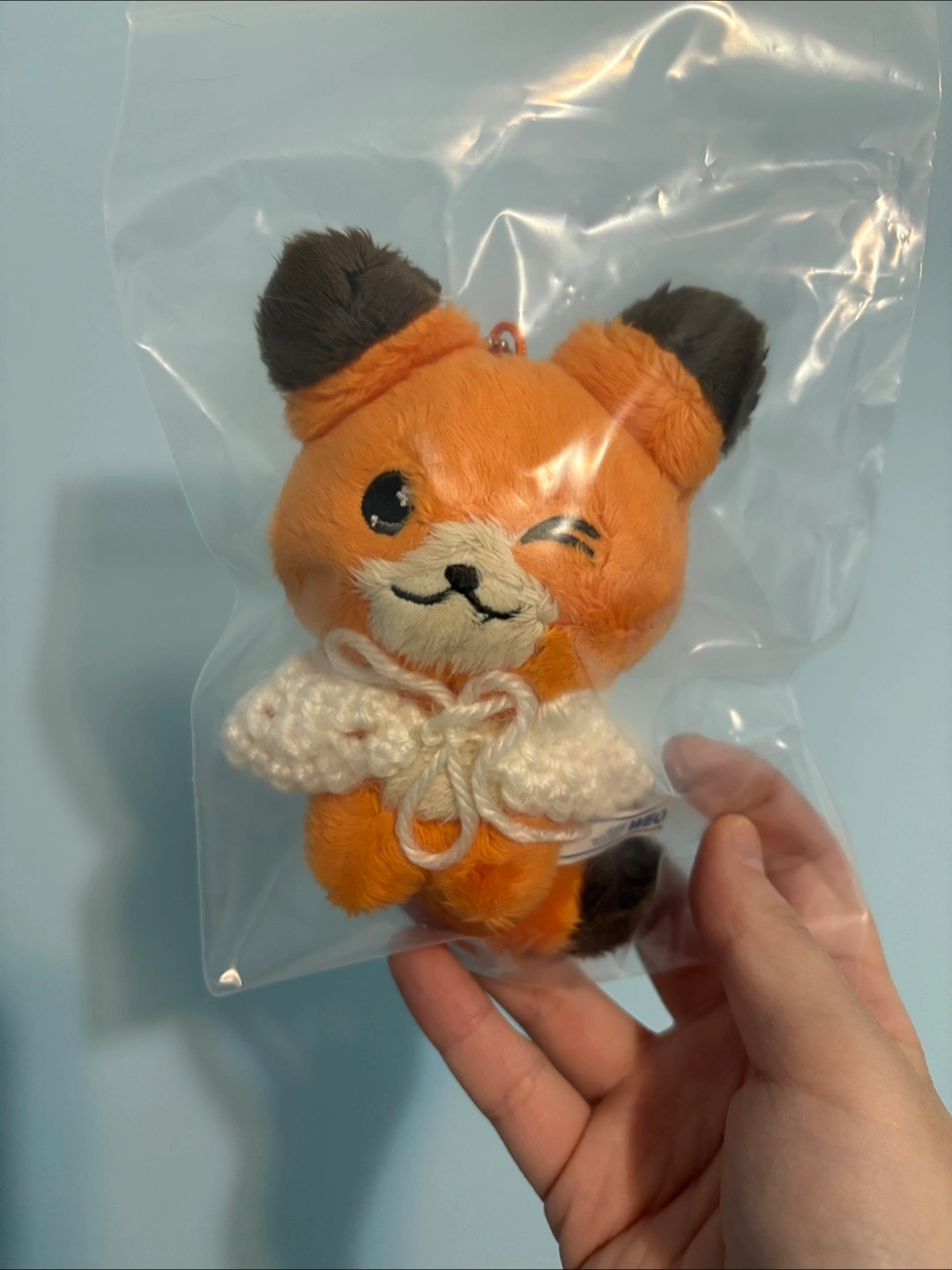 🦊 A charming fox plushie, comes in a clear plastic bag. The fox is winking.
