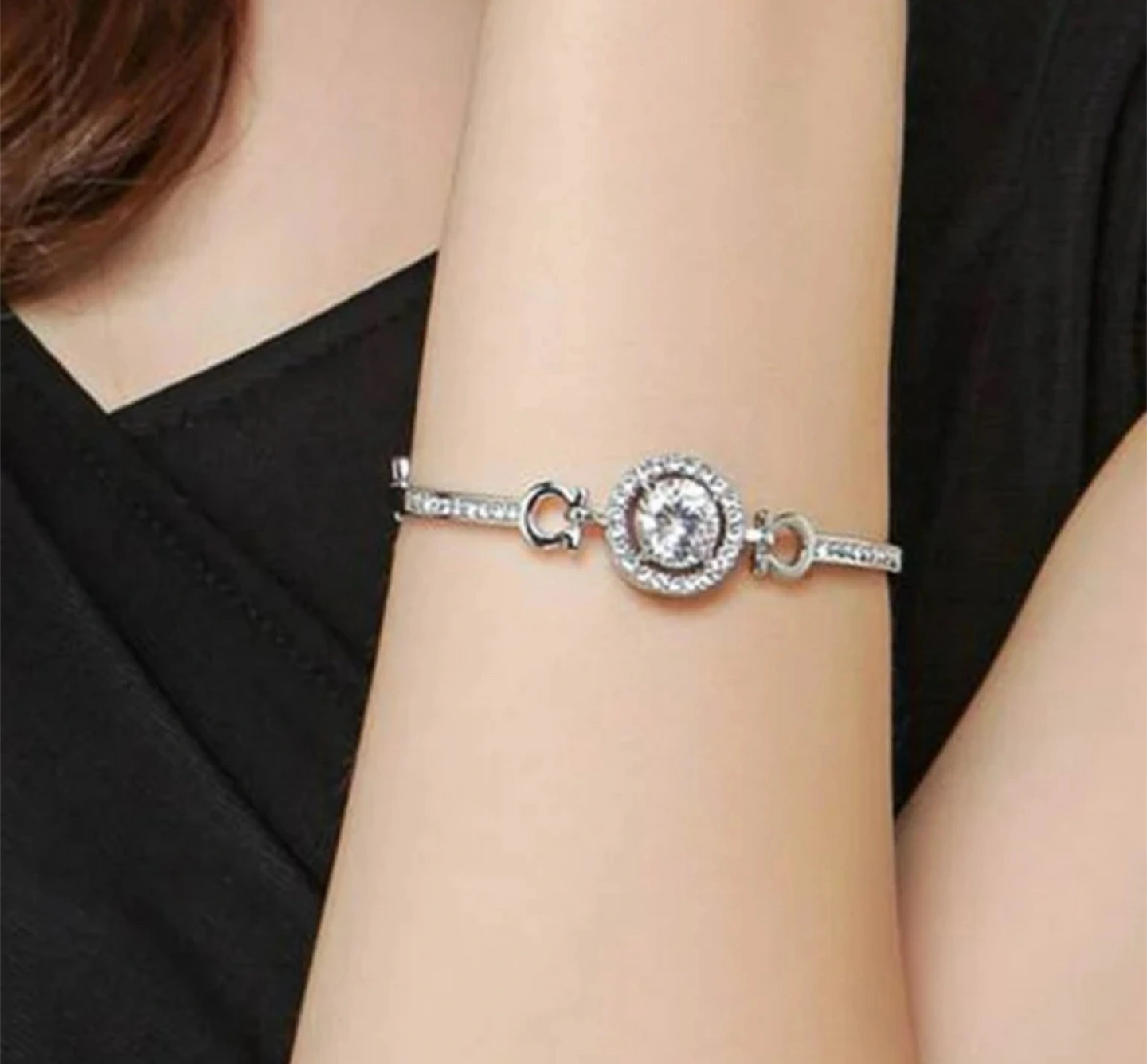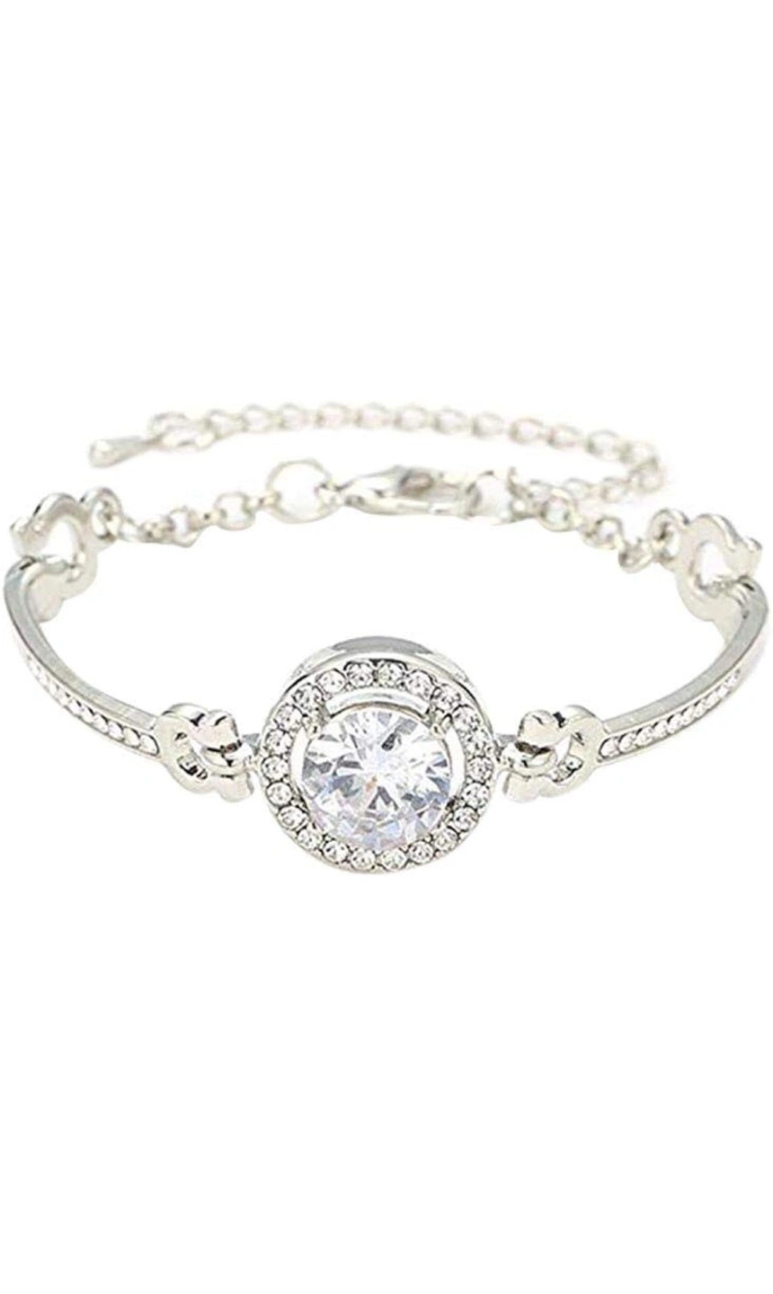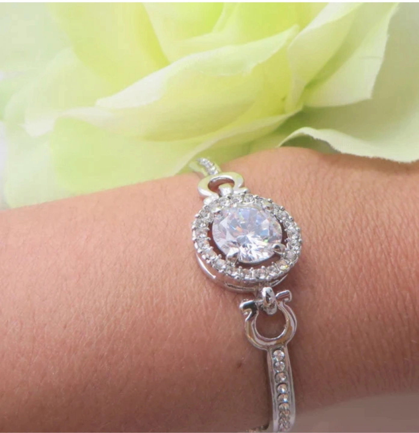 Beautiful bracelet. Features a large, clear, circular stone at the center. Other smaller stones appear to encircle the center stone. The band is thin and silver. Perfect for adding a touch of elegance to any outfit.