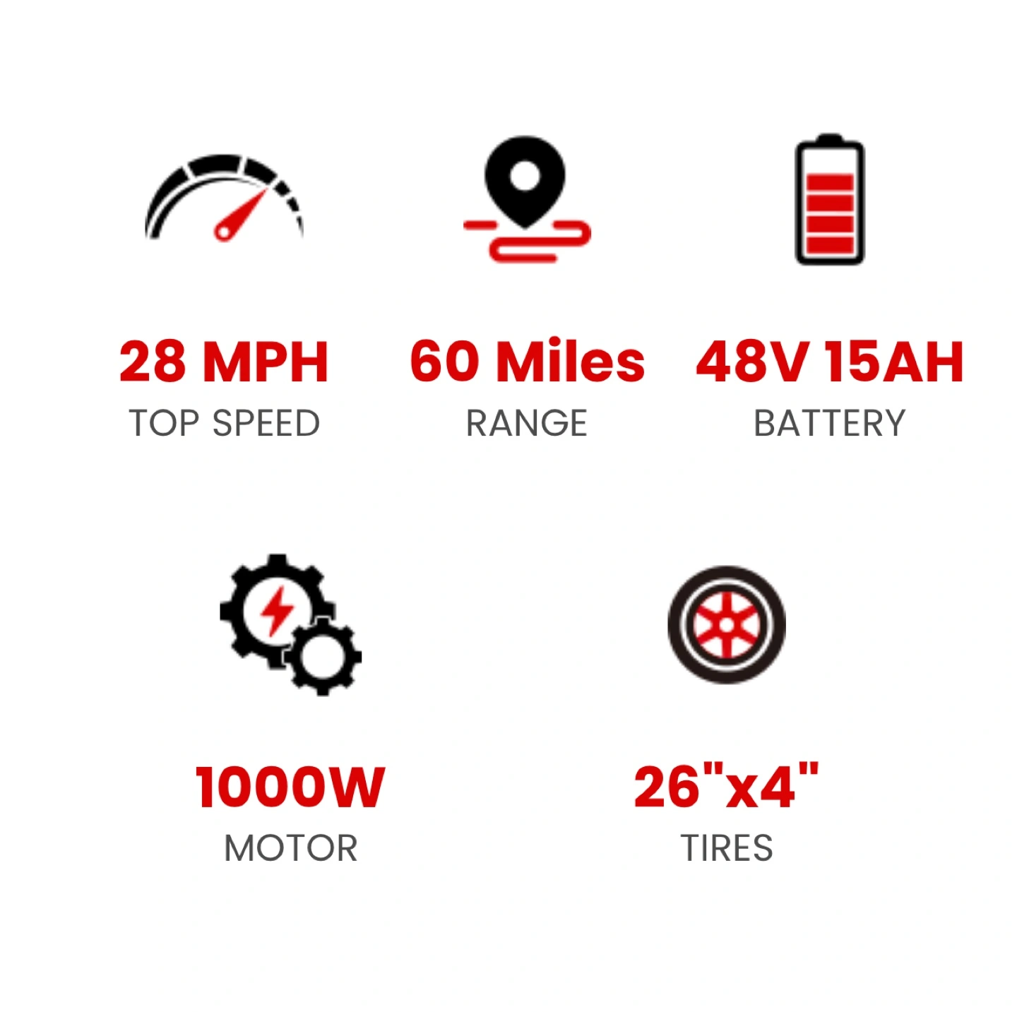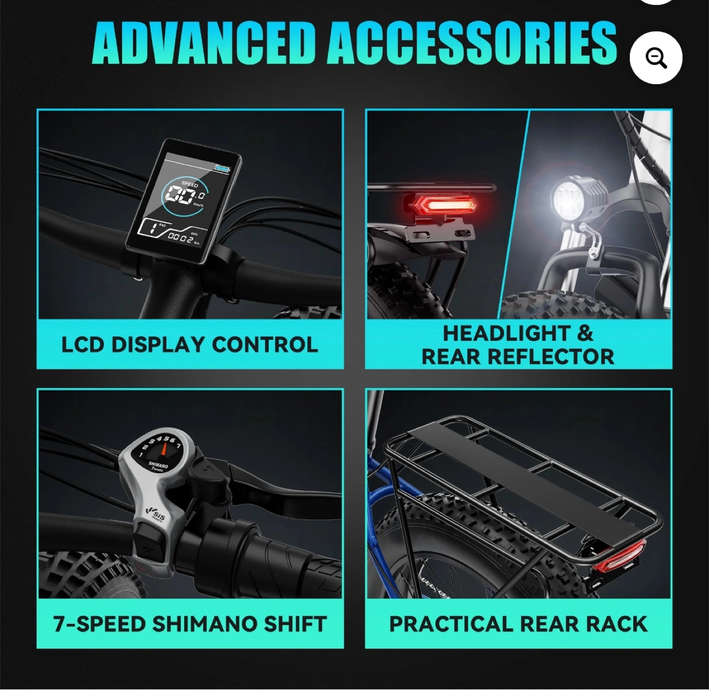 AMYET EB26 Electric Bike for Adults, 26*4.0 Fat Tire E-Mountain Bicycle,Peak 1500W Motor 48V 15Ah 7-Speed Ebike UL2849. 32 Mph max speed.