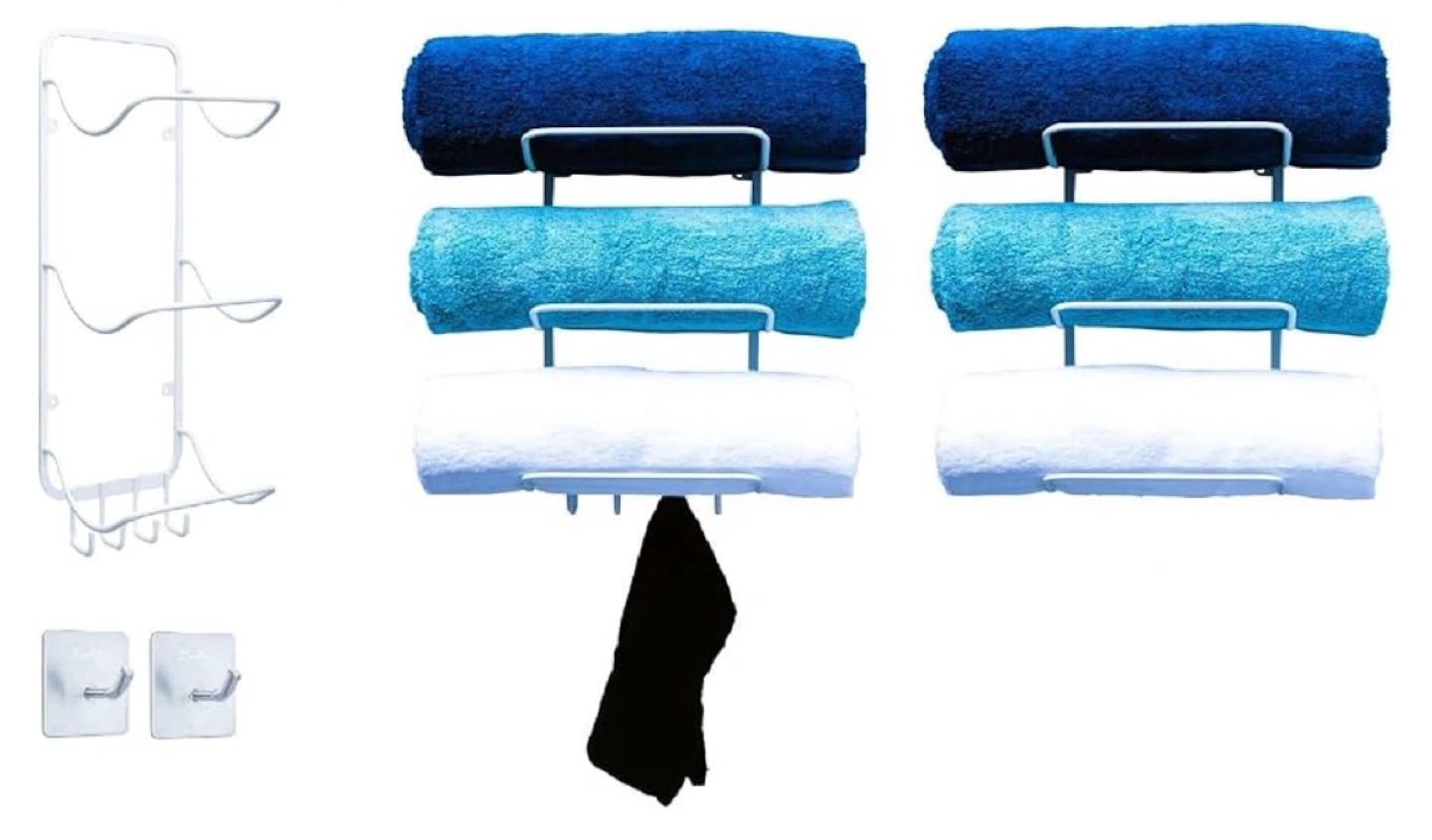 Comes complete with two self adhesive steel hooks for additional hanging space for your towels or garments.