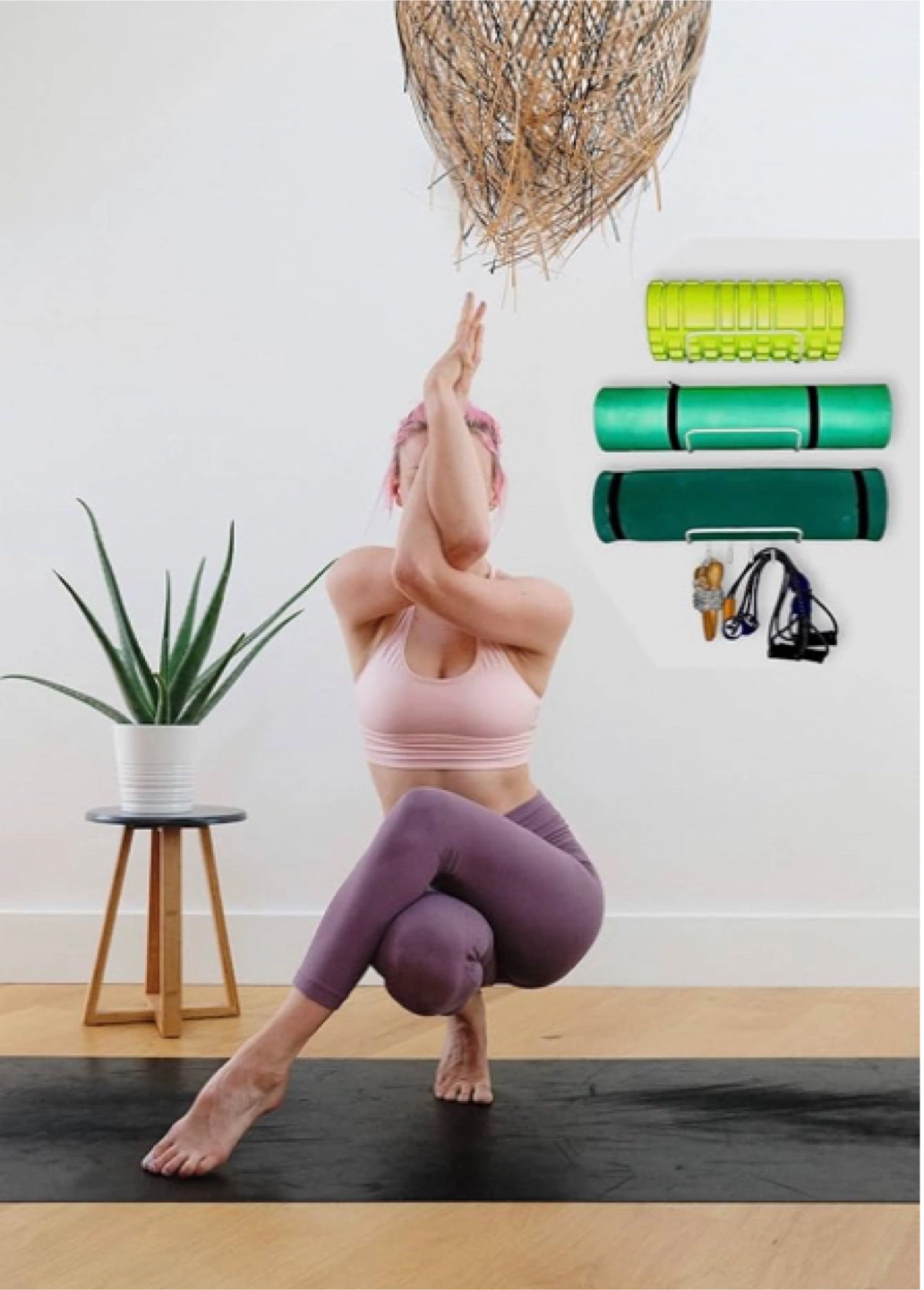 Our yoga mat rack offers a practical solution for neatly storing away your yoga equipment or can alternative;y be used as a handy towel rack in your bathroom.