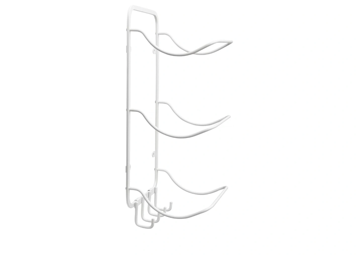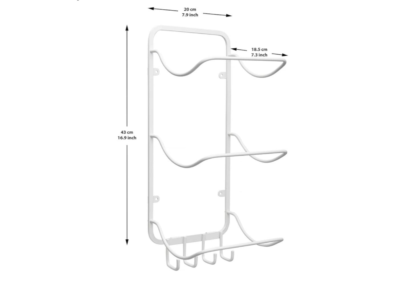 Our contoured design offers three curved shelves with four hook accessory attachment at the base. 6 shelves available as a twin pack.
