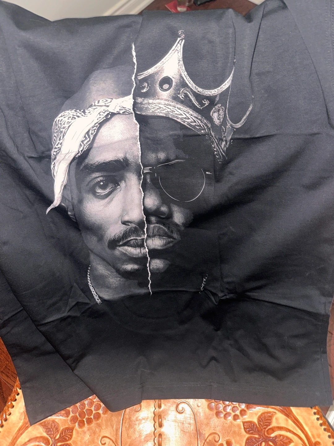 Black tee featuring a graphic print. The shirt showcases a split image of Tupac and Biggie.