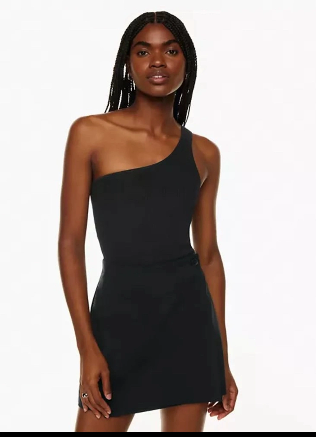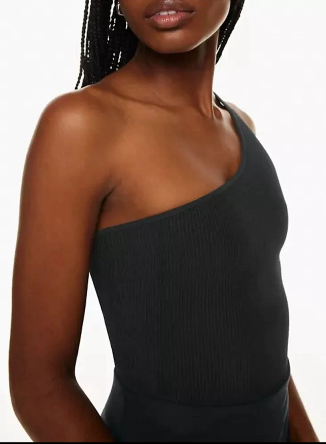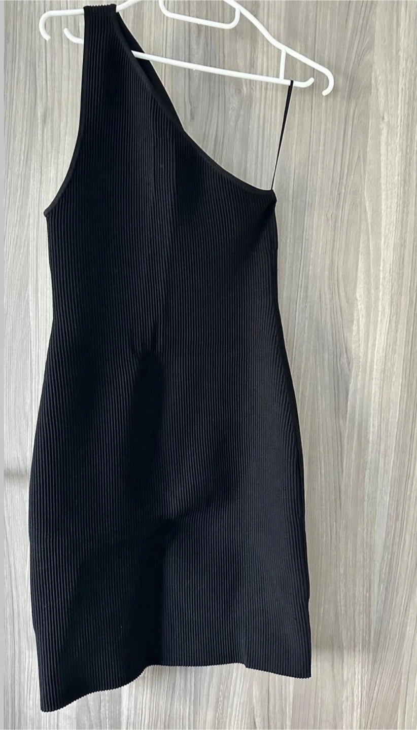 Black bodycon dress. Features a one-shoulder design. Ribbed texture throughout. Makes for a perfect addition to any wardrobe.