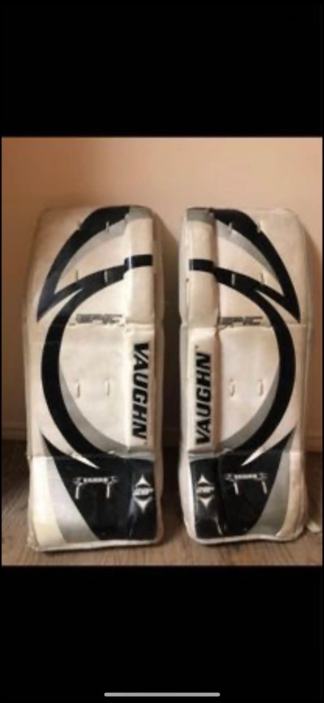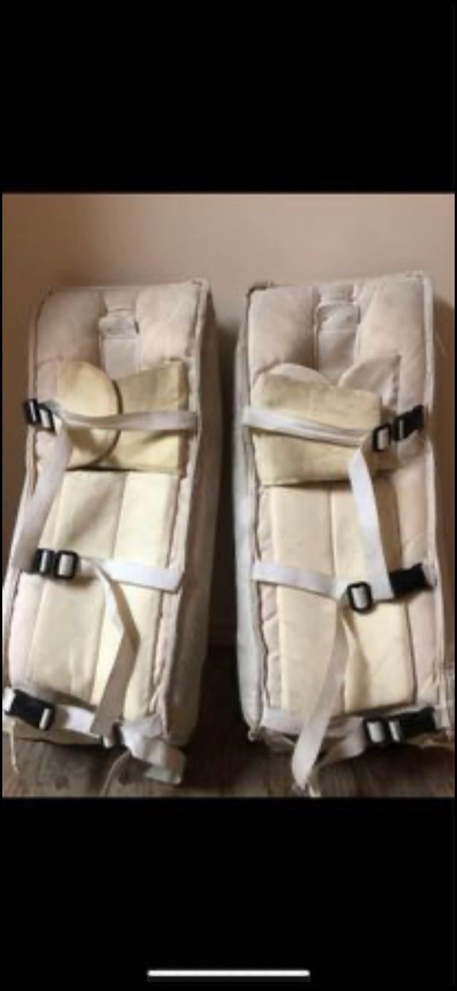 A pair of goalie leg pads. Features white and black design. Straps are visible on the back of the pads. A perfect way to relax and unwind after a long day.