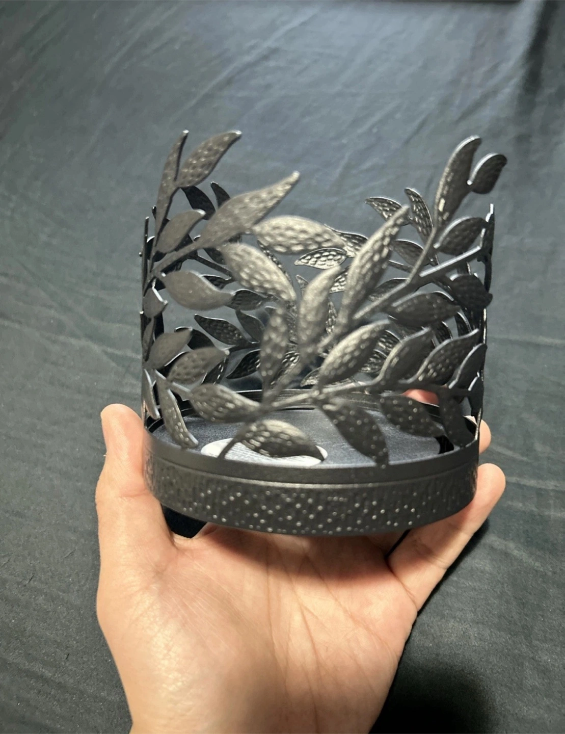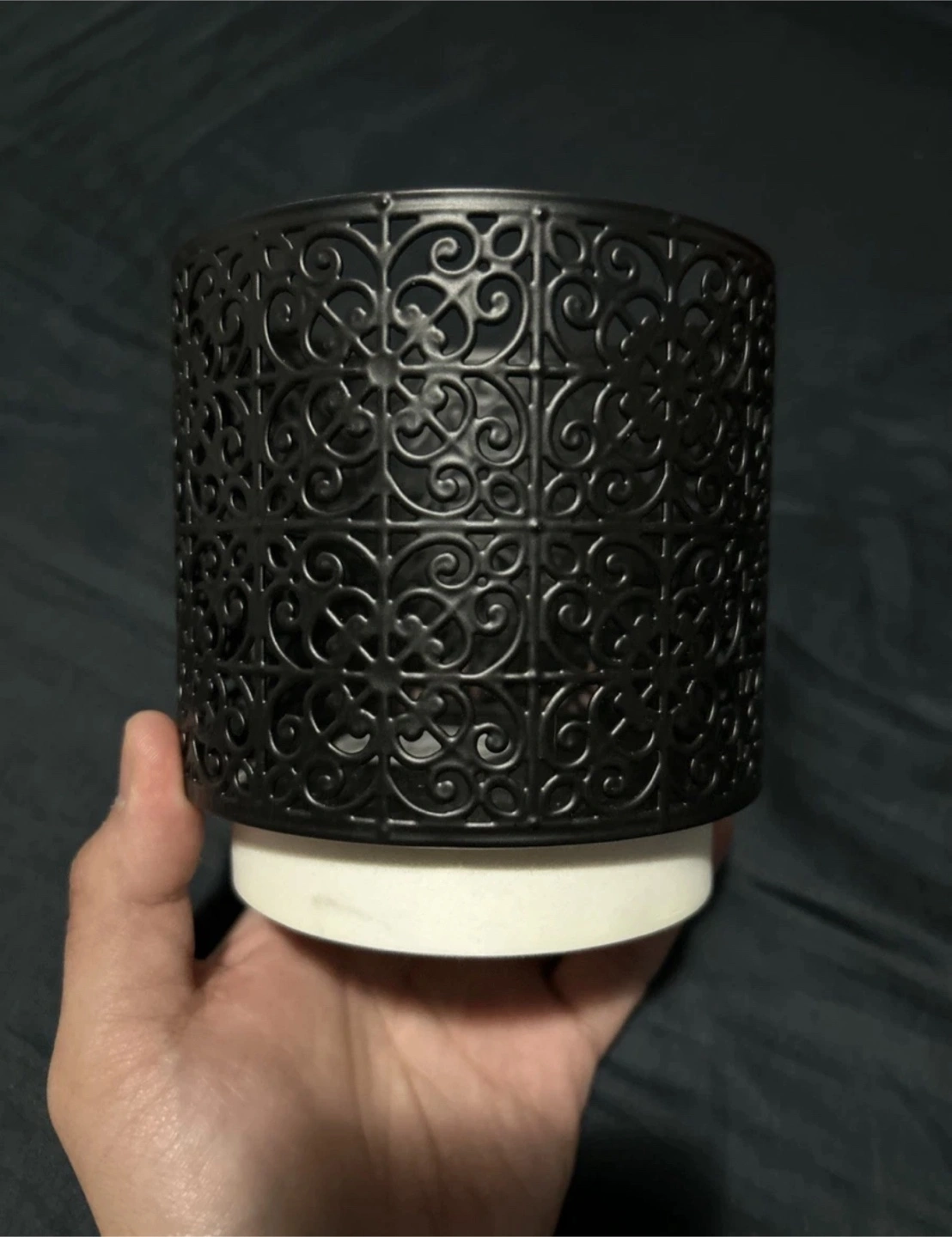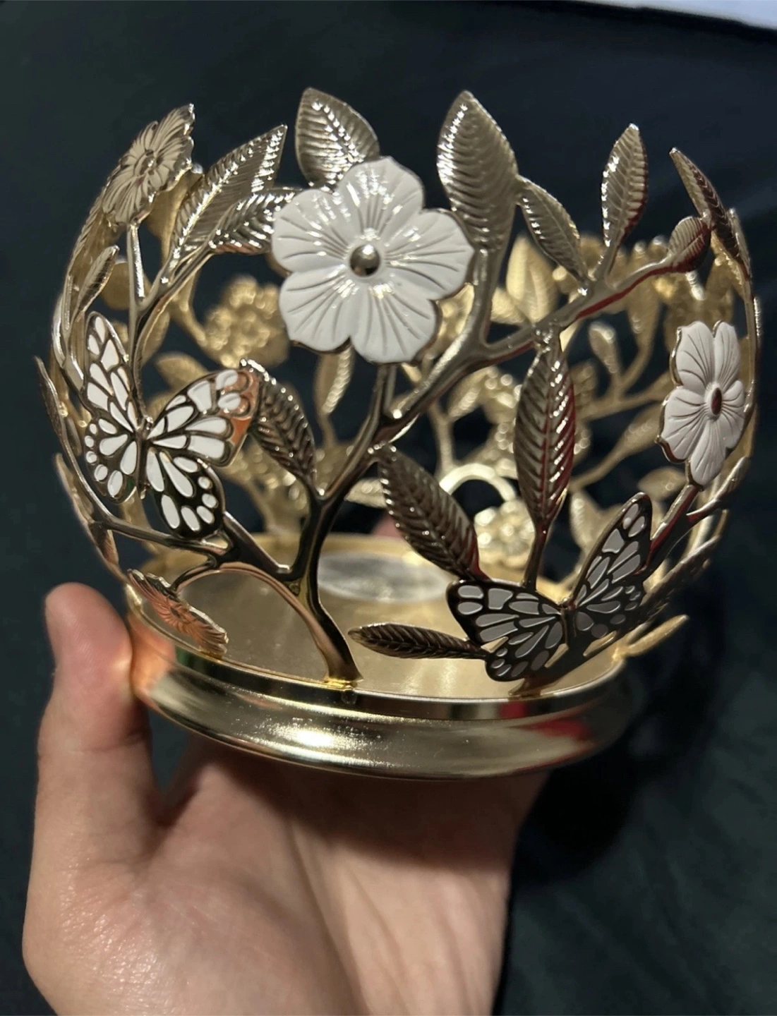 Three beautiful candle holders. One in a gold tone with flower and butterfly details. Another with a black intricate design. One is designed with leaves. Placing these around your home can create a peaceful ambiance. $25 each