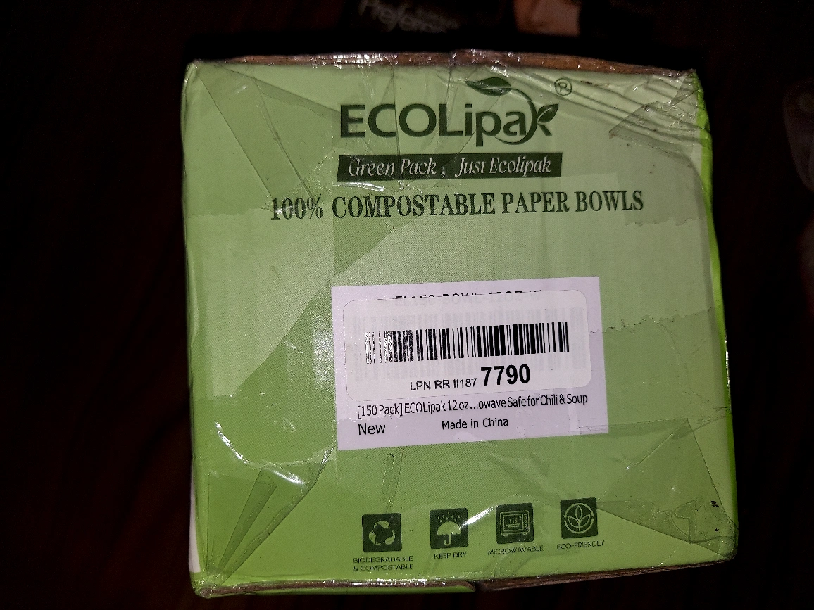 A box of white, compostable paper bowls. They are made from paper and come in a box. They are safe for chilly soup. These bowls make for easy cleanup after a gathering.