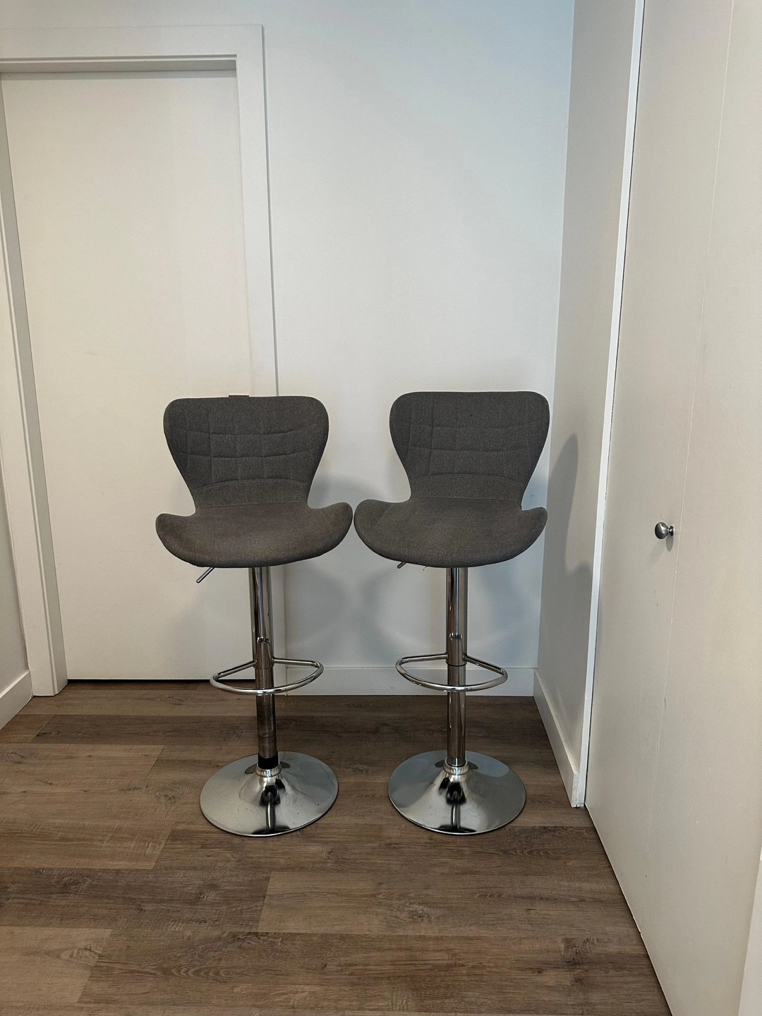 Two bar stools in a soft grey fabric. Chrome finish on the base and column. Swivel feature and footrest. A great addition to any kitchen island or home bar for a relaxing and stylish experience.