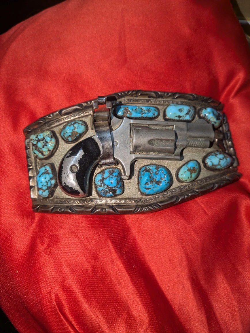 A unique belt buckle. Features a revolver design with turquoise stones. This piece would make a wonderful addition to any collection.