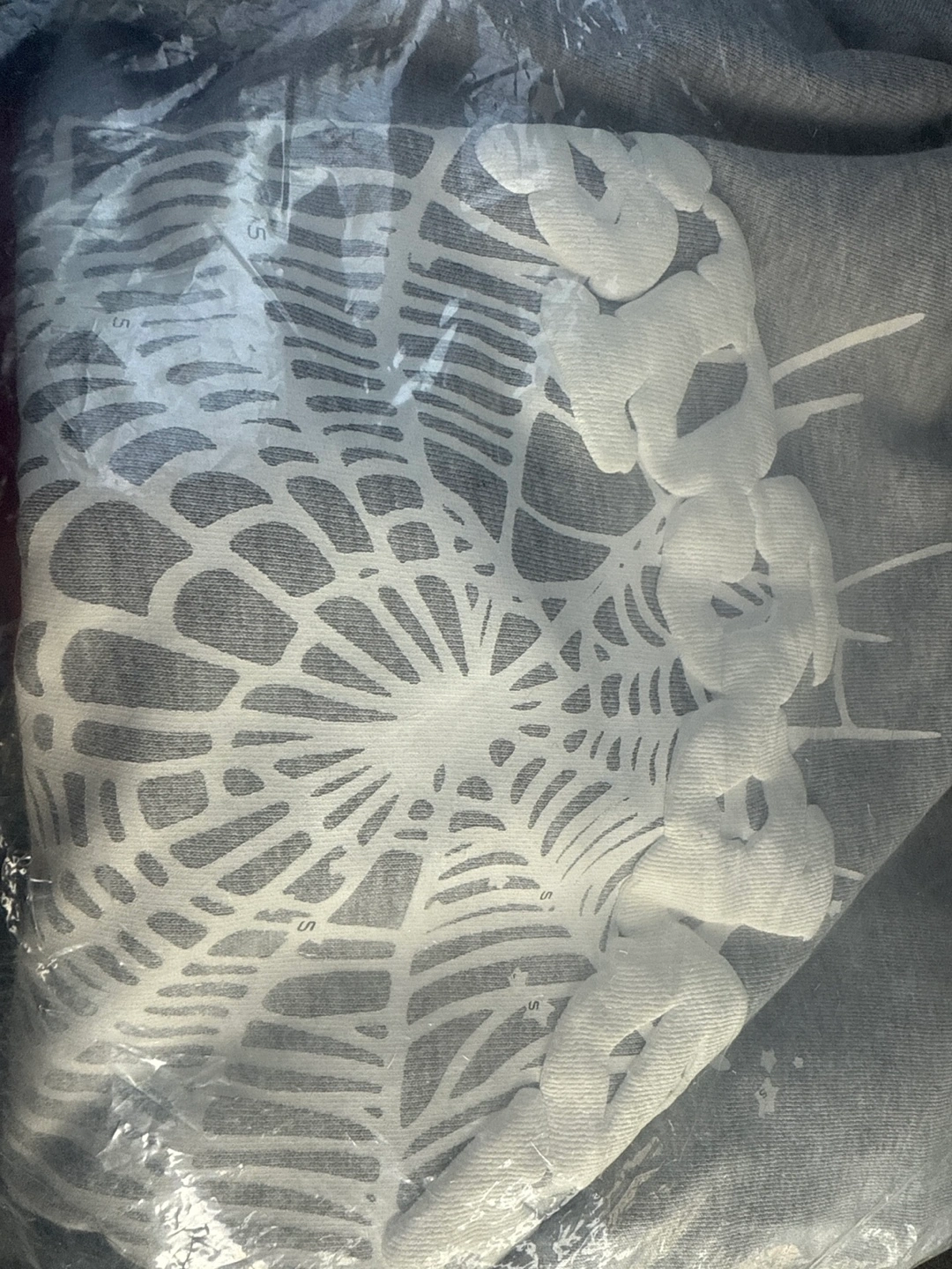 A hooded sweatshirt, sealed in a plastic bag. The garment has a large spider web graphic. Inside the sweatshirt is a unique tag. This garment would be perfect for relaxing on a cozy evening.