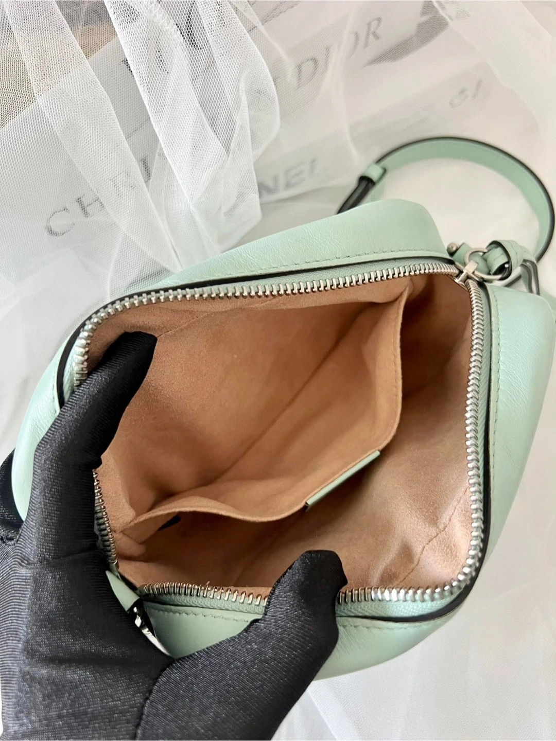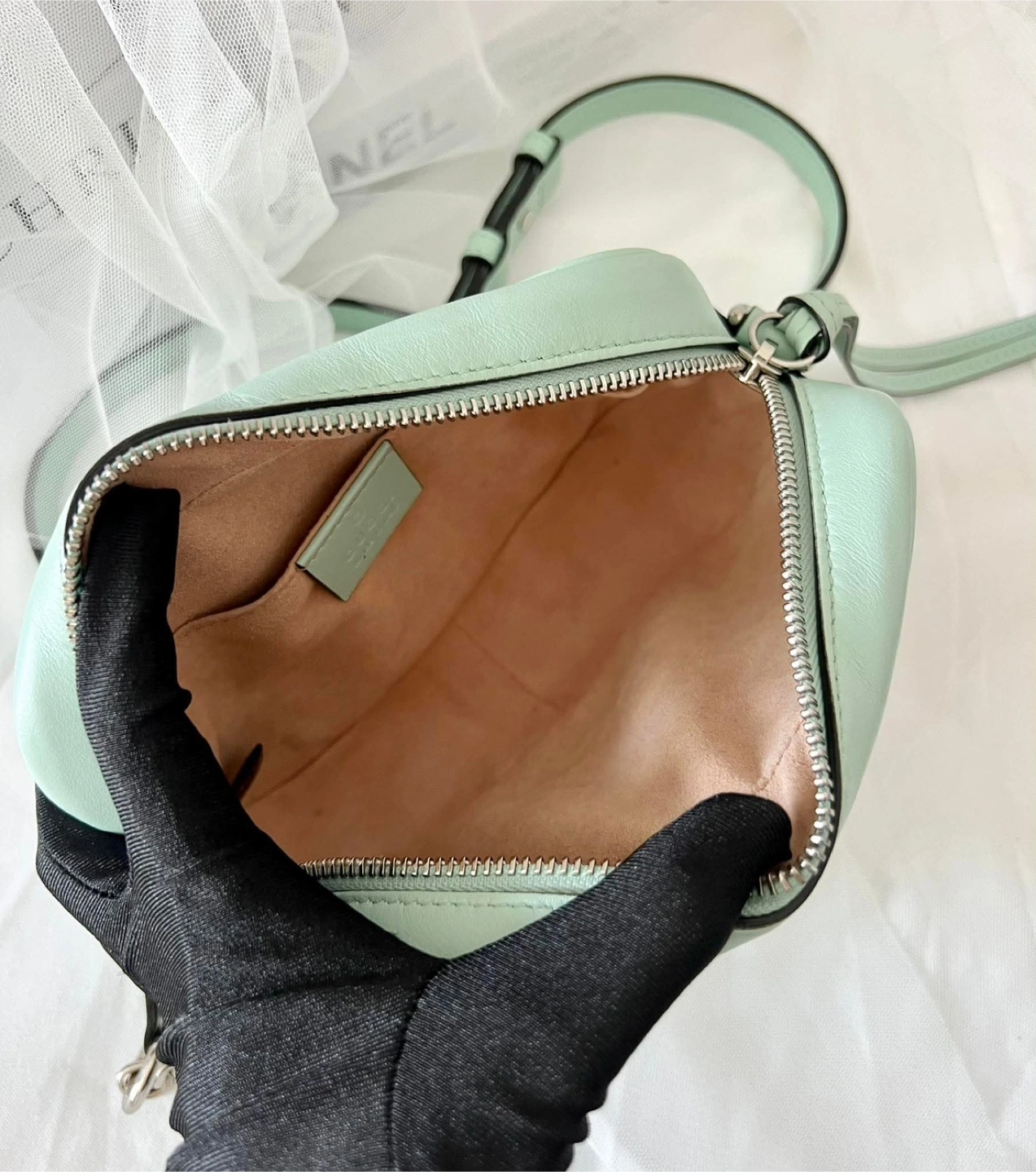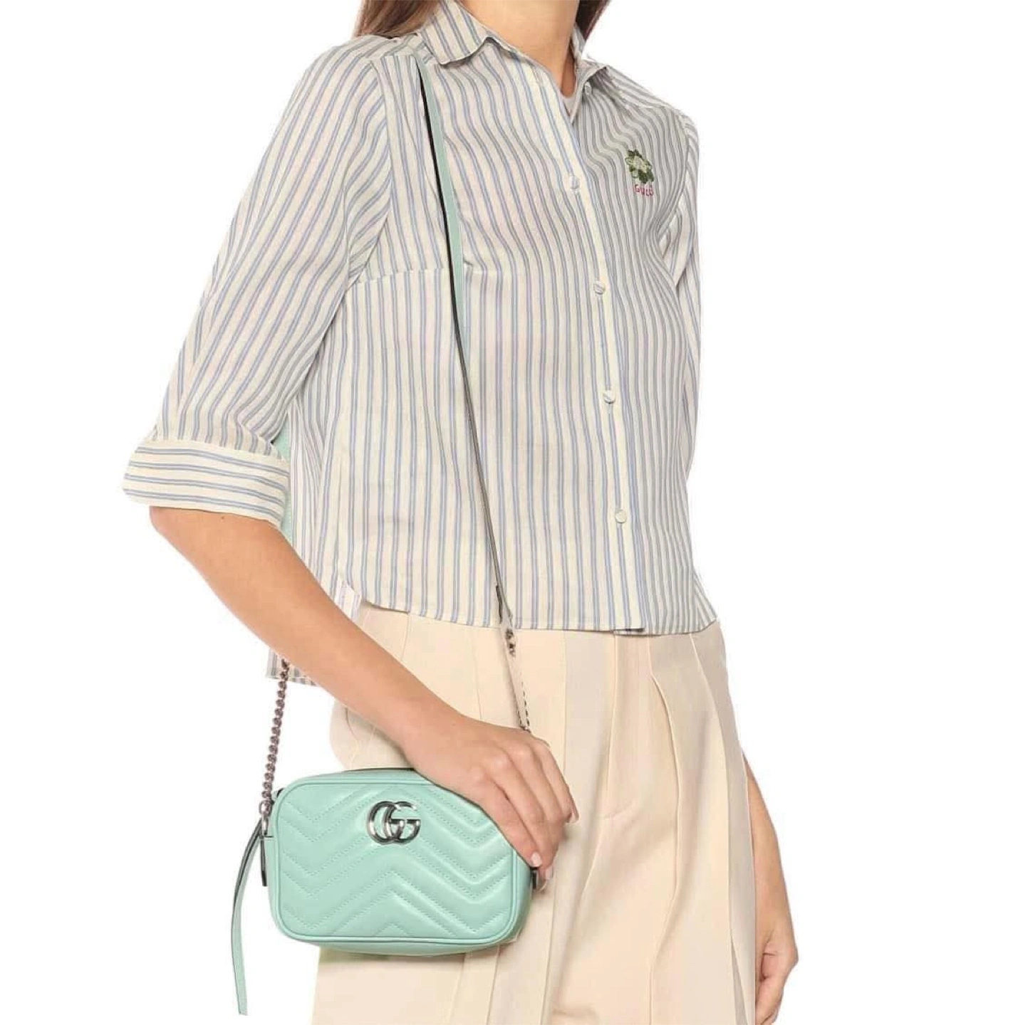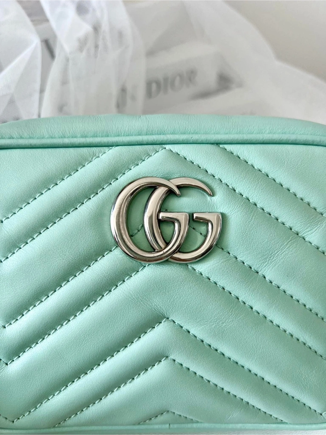 33Mint green, crossbody bag. Comes with dustbag. Chevron quilting across the surface. Features a silver chain shoulder strap. The signature GG emblem is visible. This would be the perfect bag for a stroll through the city.