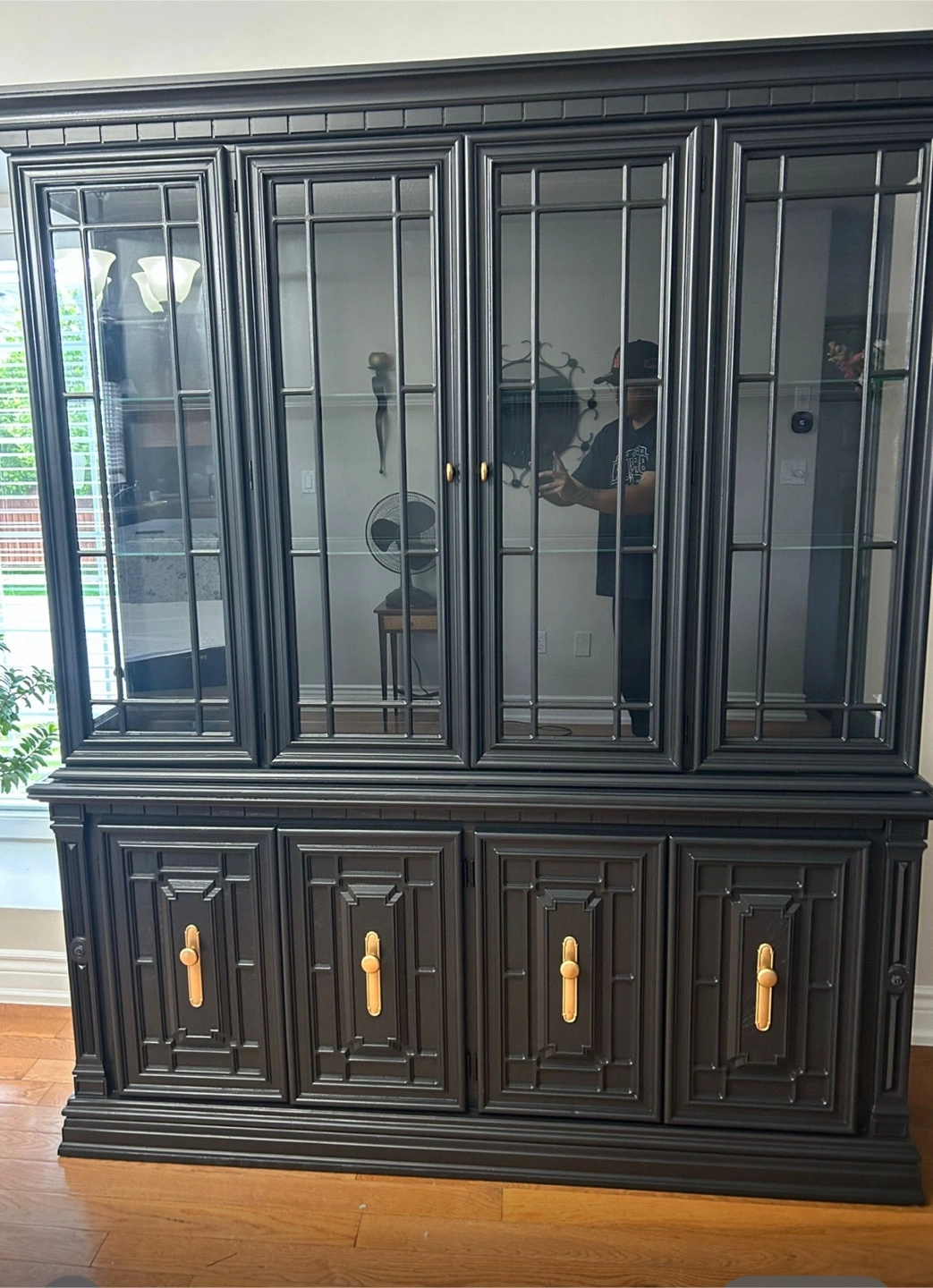 The display cabinet has glass-panelled doors on top, and solid doors below. Gold-coloured handles. It is great for displaying your finest china.78,1/2 in High— 66 in wide