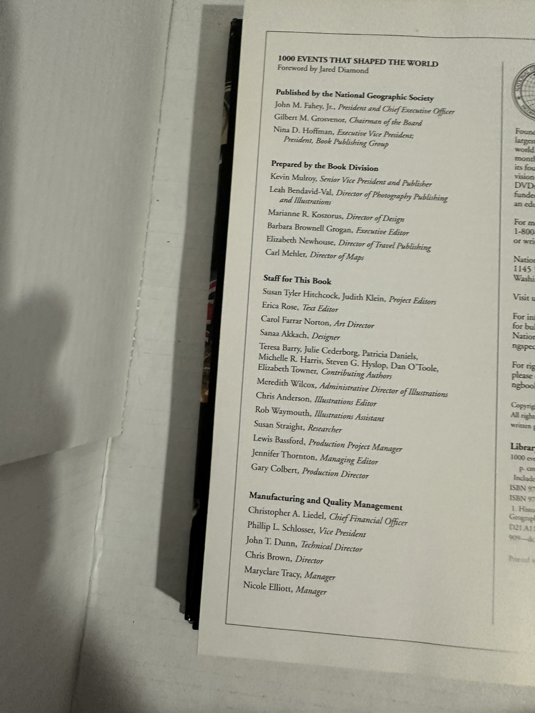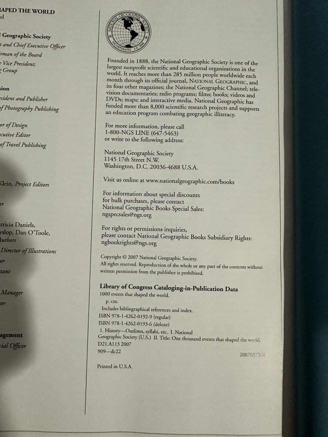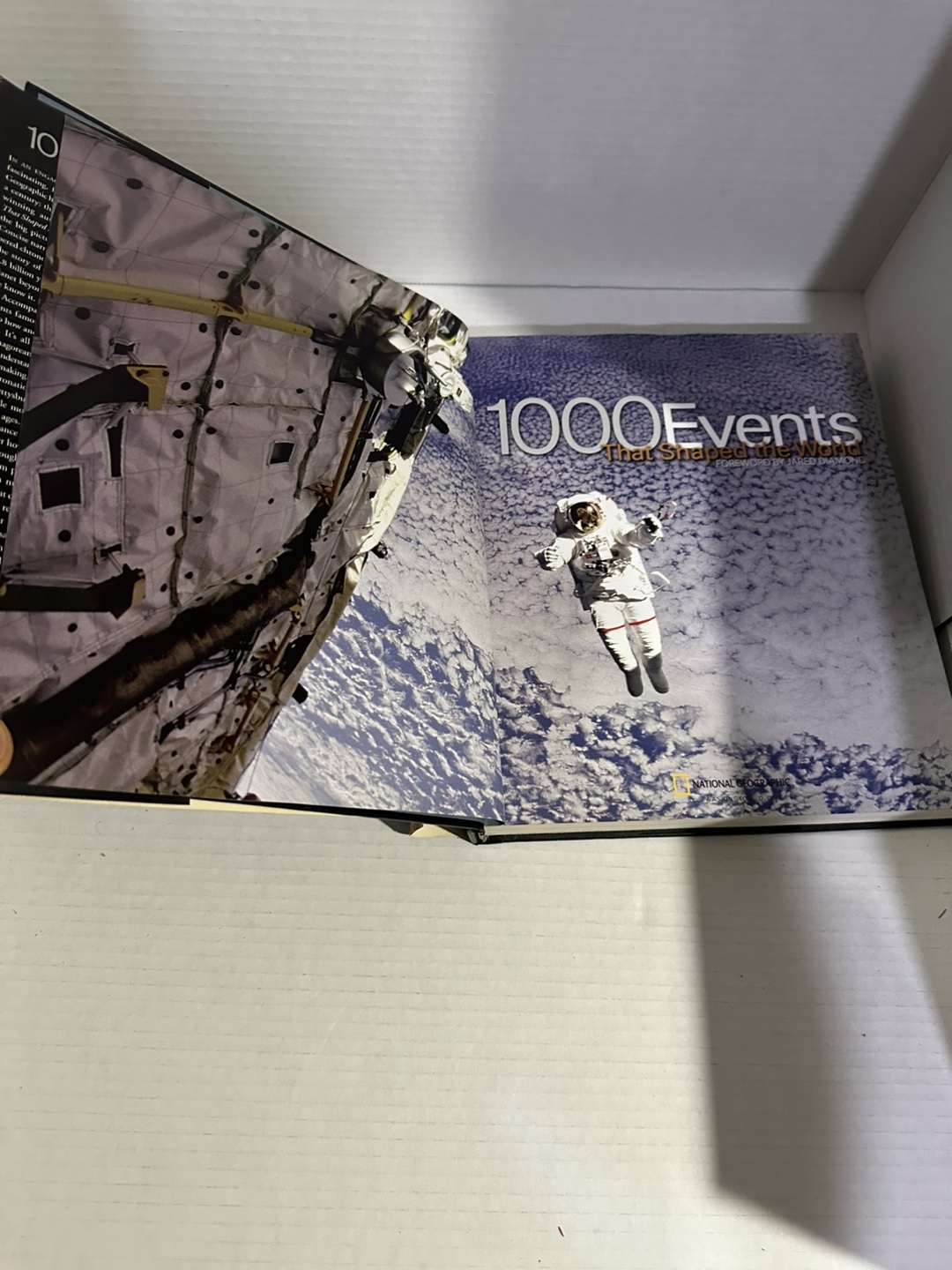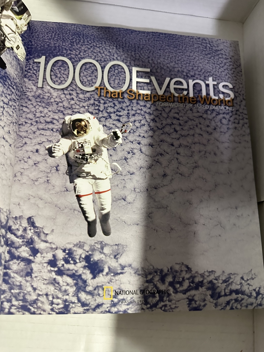 I am offering a hardcover book. The title is 1000 Events That Shaped the World, with the foreword by Jared Diamond. The cover shows a striking image of an astronaut floating in the clouds. You can use this book to help create a peaceful bedtime routine.