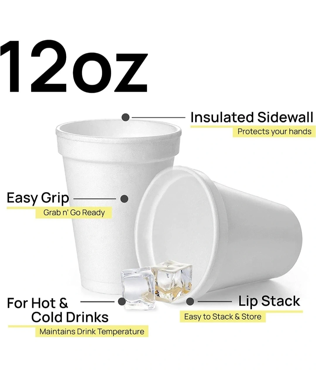 12oz disposable foam cups. There are 100 cups in the pack! These cups are great for hot and cold beverages like coffee, tea, hot cocoa, soup, broth, smoothie, soda, and juice. Originally bought for $55.99