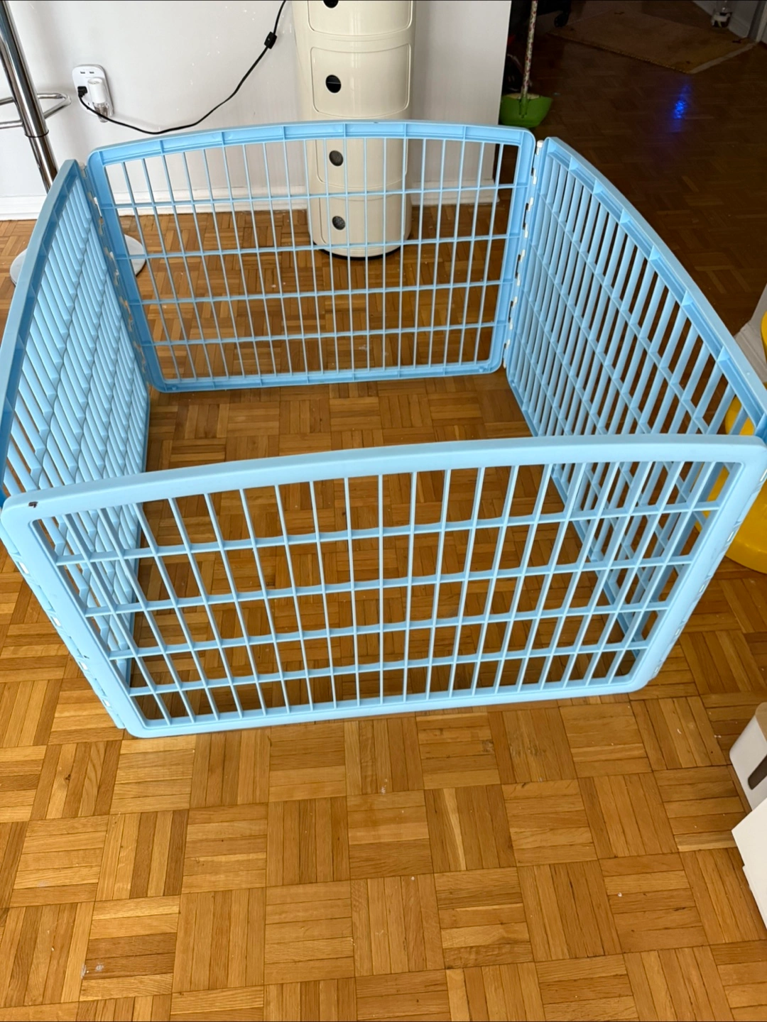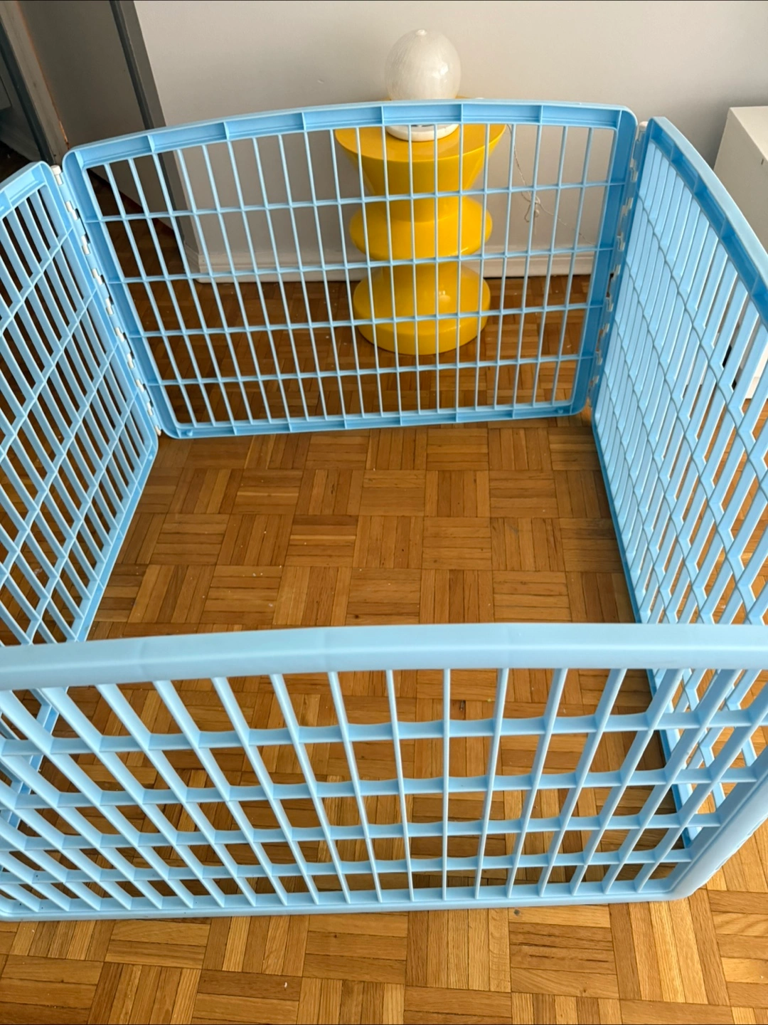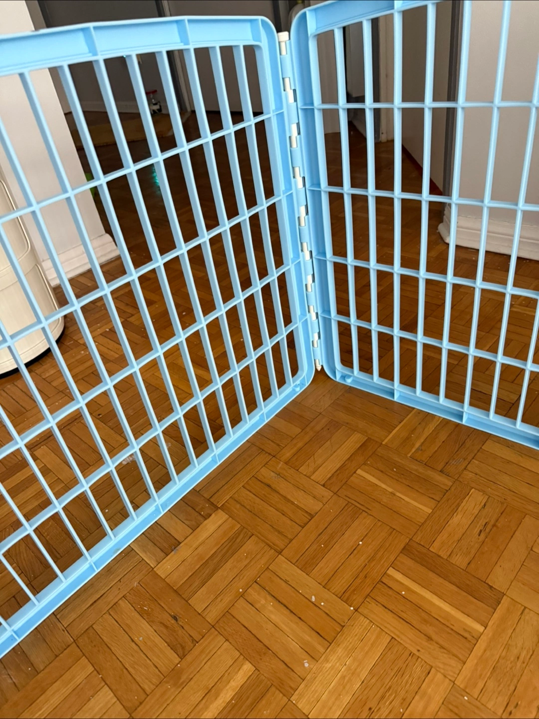 Light blue playpen. Panels connected by hinges. Can be used to keep your pet in a secure area, providing you with some peace of mind.