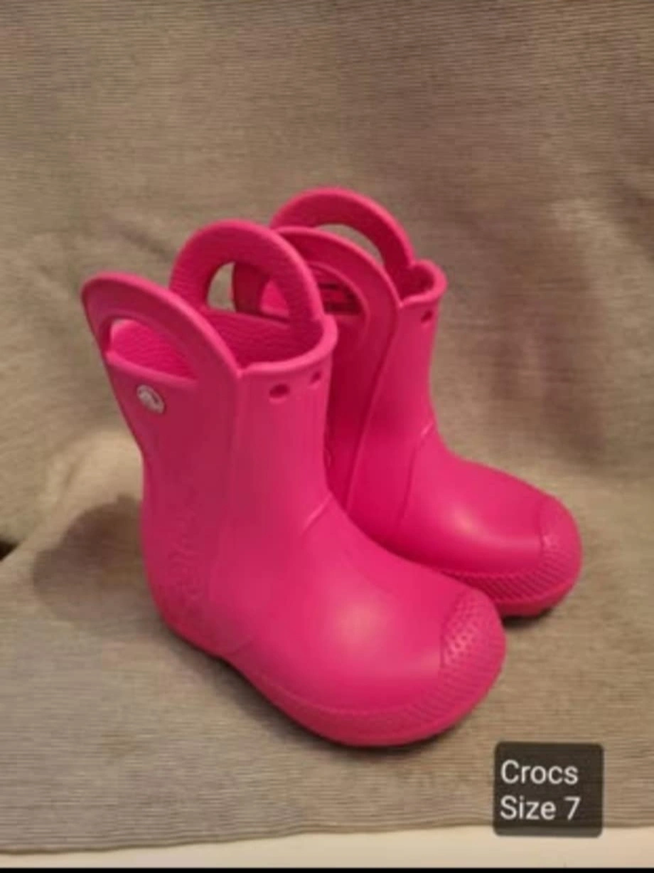 These vibrant boots are sure to brighten up any rainy day. They are a fun hot pink colour, made of a rubber-like material and have an easy to grab handle on each boot, great for little hands. Getting these would be perfect for any child looking for fun and fashionable footwear. Worn once, excellent condition , size 7 toddler