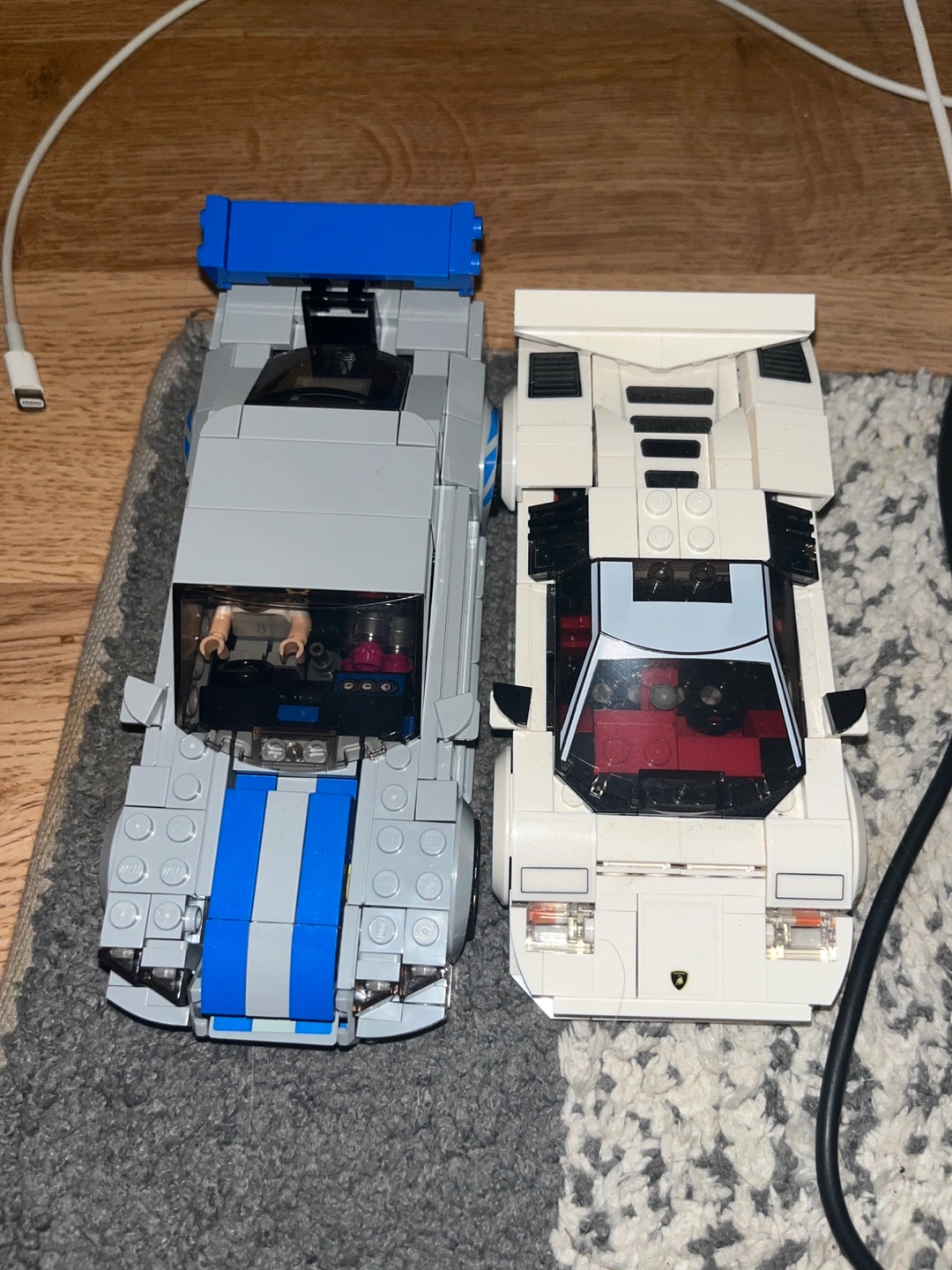 Two cool toy cars, built out of Lego bricks. One car is light grey with blue stripes and a blue spoiler. Another car is white with black details. These cars would be a great way to relax and unwind after a long day. ($10 each)