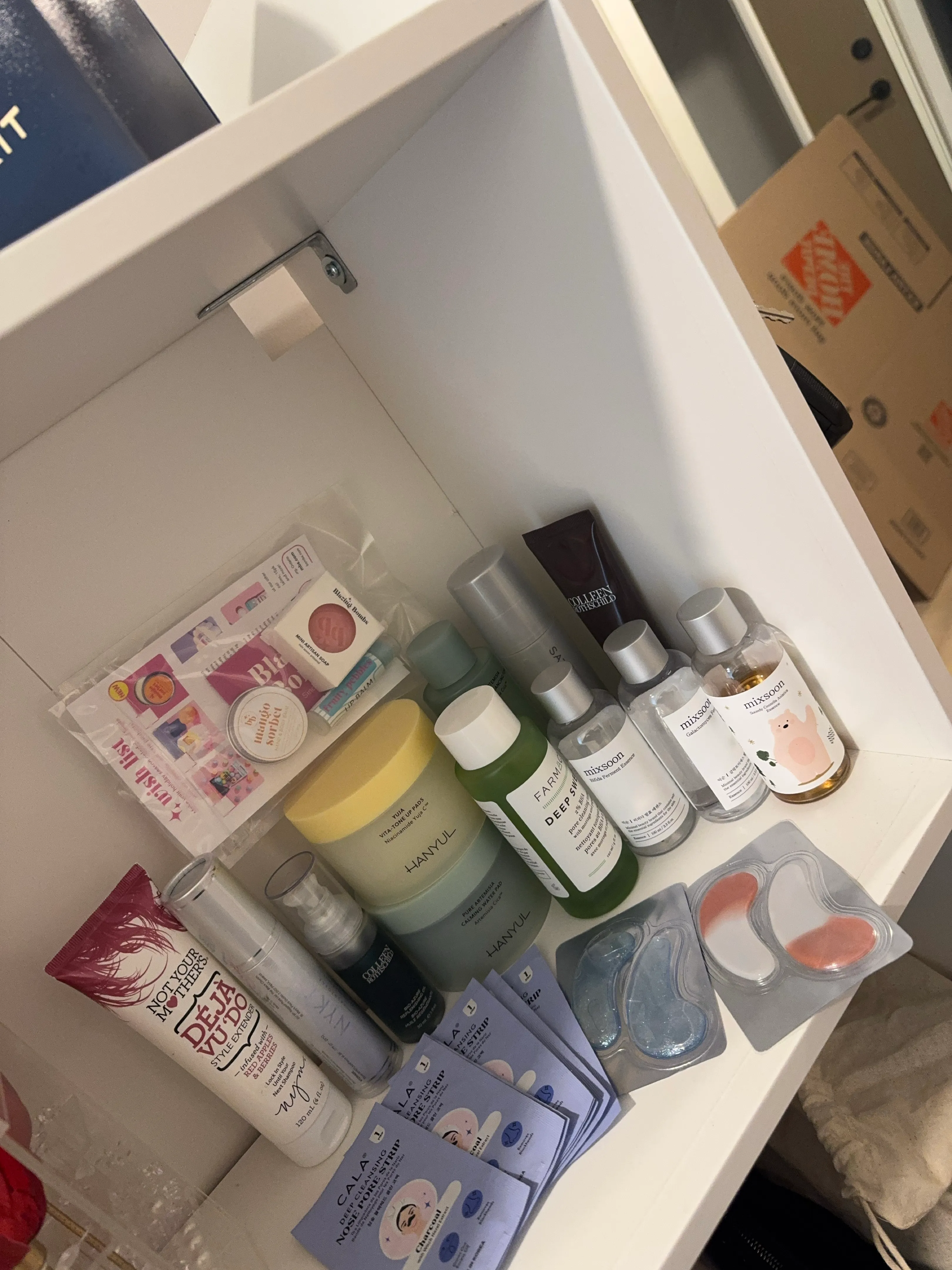 Various skincare/beauty products — including eye patches, overnight hydrating mask, toner pads, toner, bio-azure replenishing oil, lash growth serum, mixsoon essence, and hair repair treatment