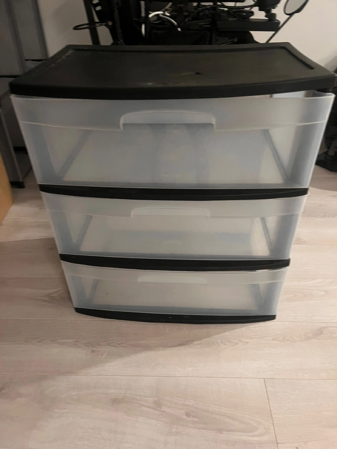 A great storage unit for your crafting supplies, keeping them tidy and in one place. The storage unit has three drawers. Clear plastic drawers with black trim. The top of the unit is black.