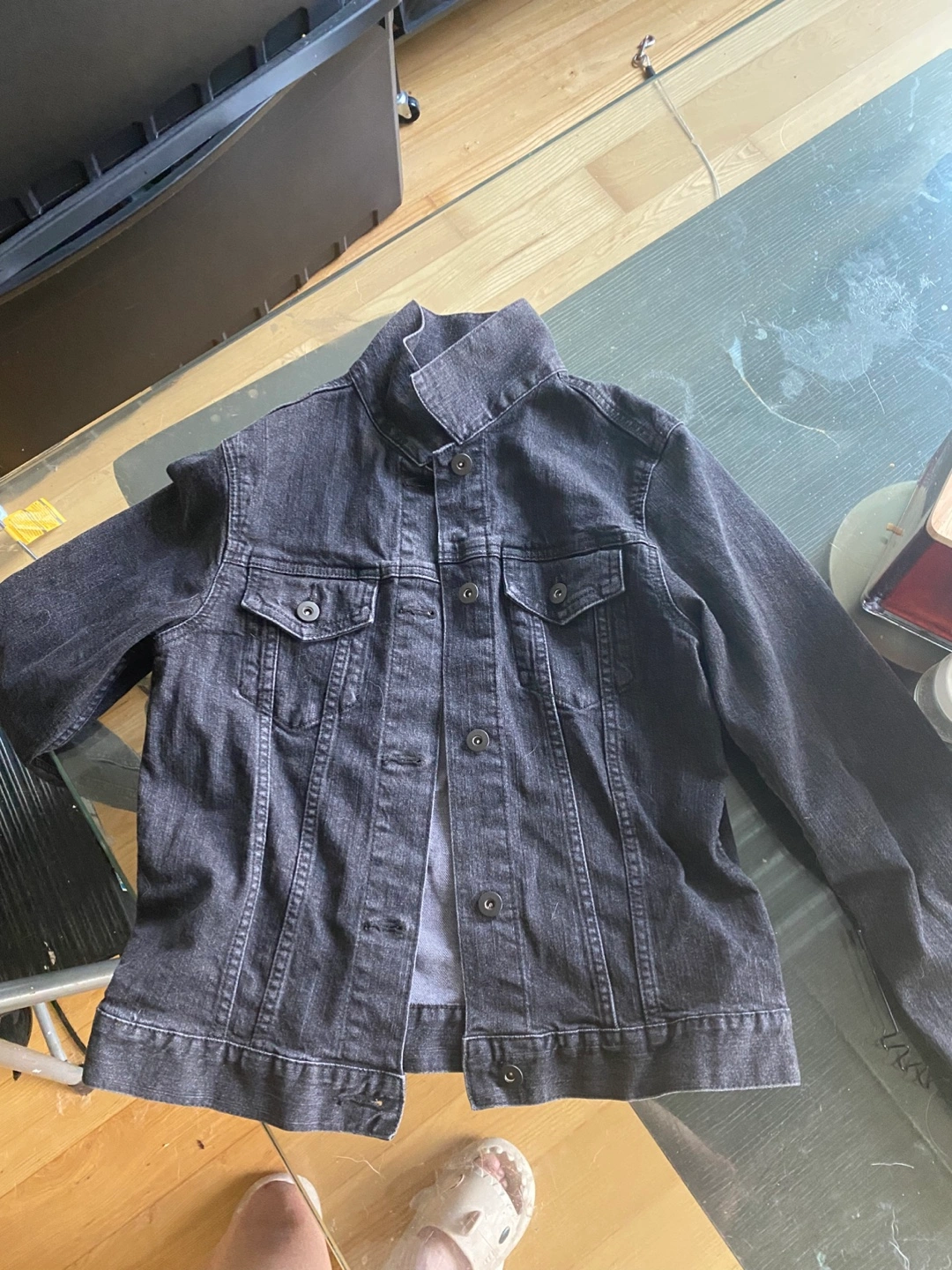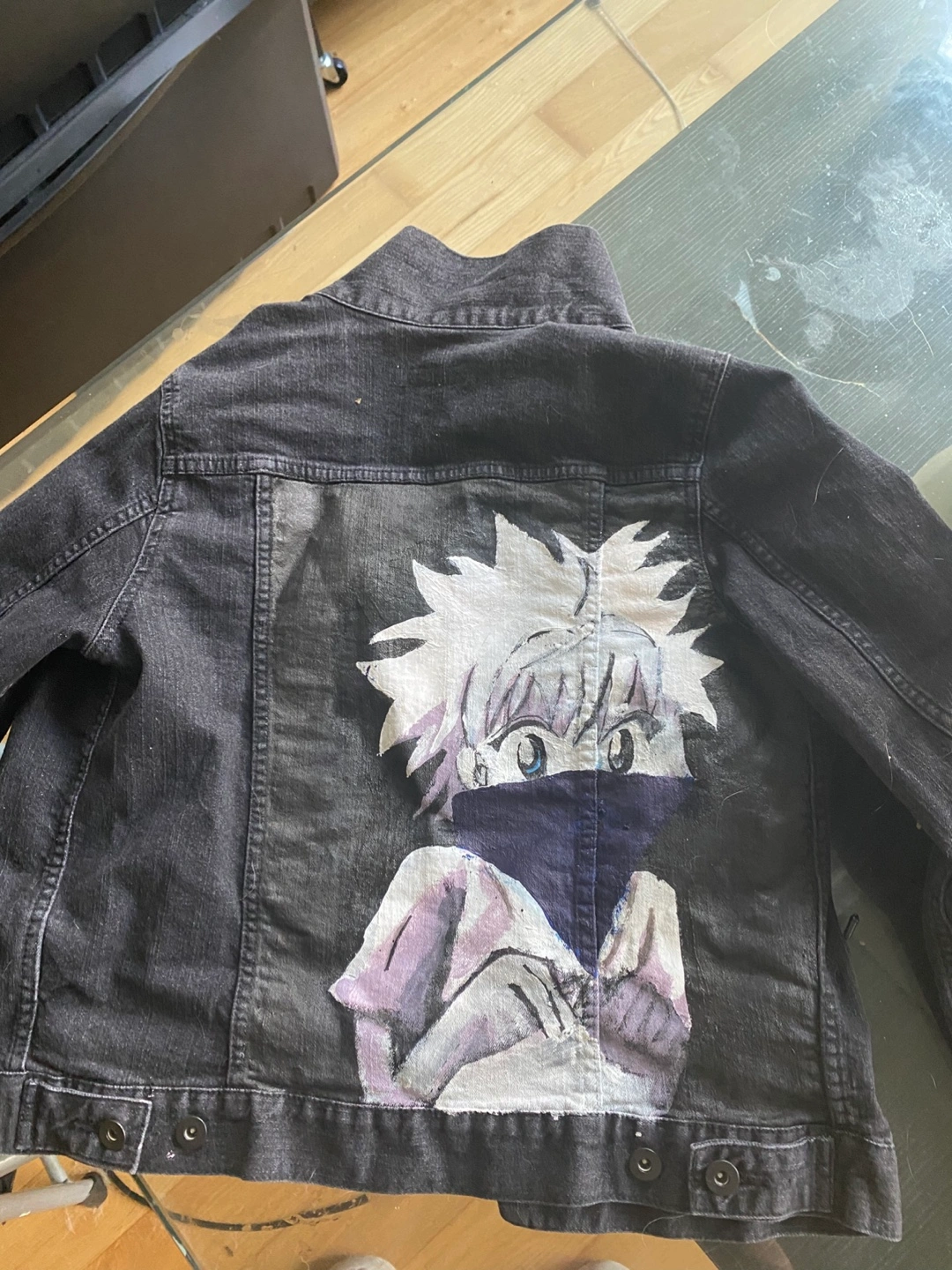 A black denim jacket from a Uniqlo pop-up event in Japan. Painted with Killua from hunter x hunter character design on the back at request from the pop-up event! I no longer fit in it π hoping to give to a good home