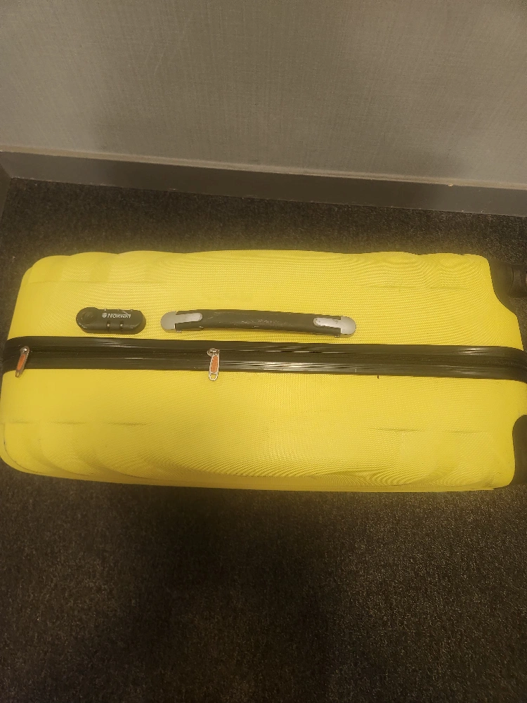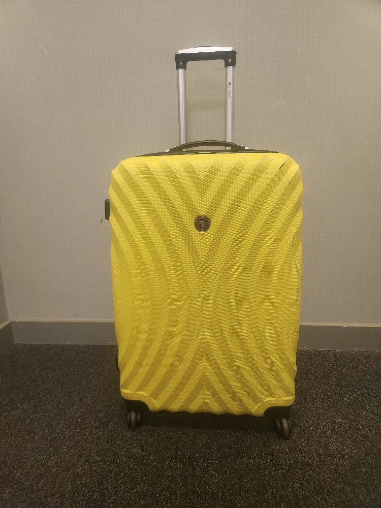 Yellow 27-inch hard-shell suitcase that does expand. Features a retractable handle. There are 4 360 degree spinning wheels for easy transport. It’s perfect for those who love to travel.