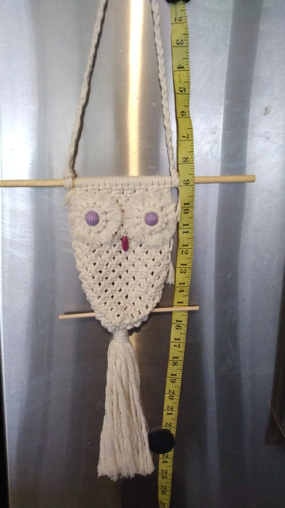 Intricate macrame wall hanging. Owl shape with details. Features a knotted body. Finished with a tassel. This wall hanging is a perfect addition to any room, as a simple act of art.