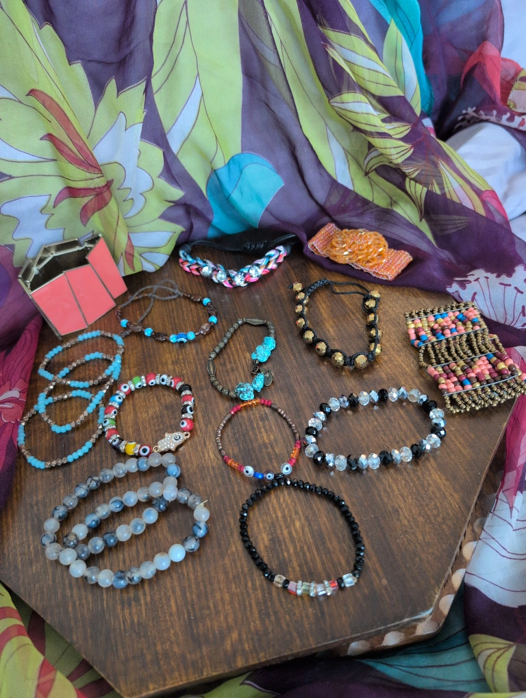 A collection of various bracelets. Some are beaded, while others have gemstone elements. All stretchy and expand according to wrist size.
