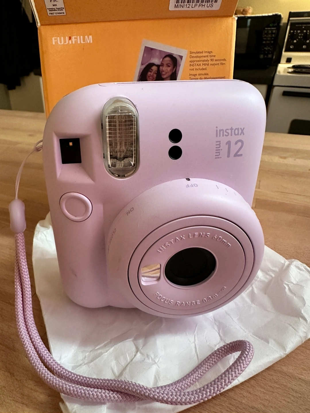 A lilac purple camera in the box. Features a lens, a flash, and a strap. Perfect for capturing memories that you can hold in your hands.