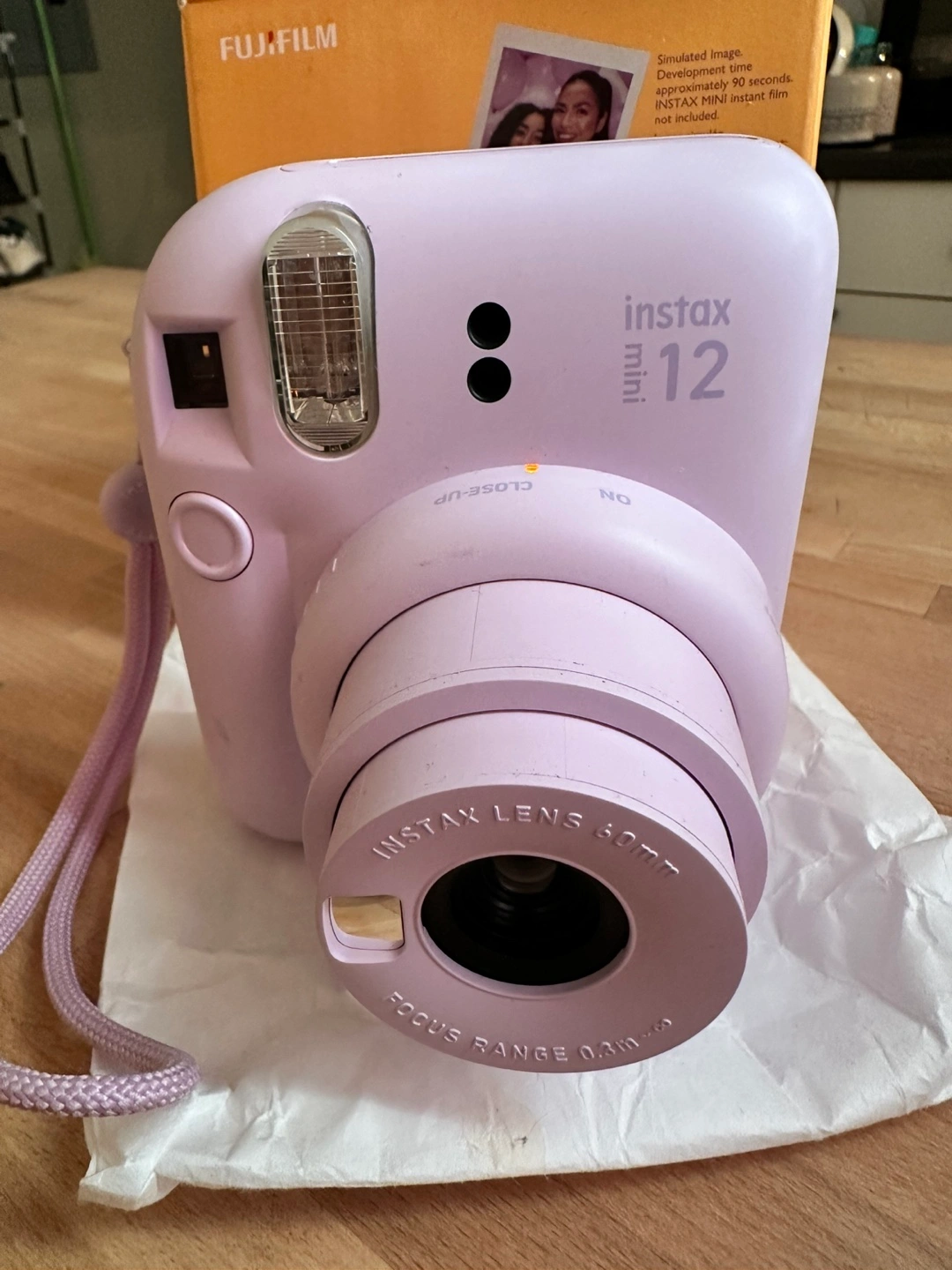 A lilac purple camera in the box. Features a lens, a flash, and a strap. Perfect for capturing memories that you can hold in your hands.