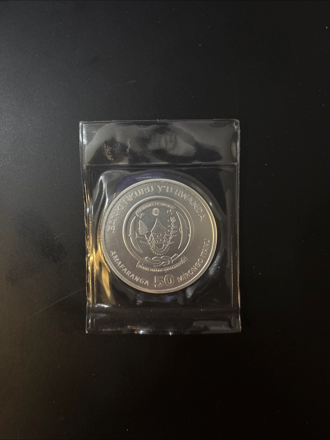 Coin inside of a protective sleeve. Depicts a ship at sea on one side. The reverse has the coat of arms for Rwanda. This is a nice addition to any collection.