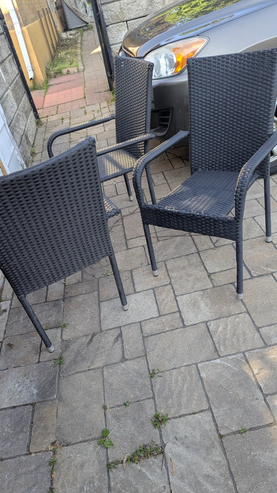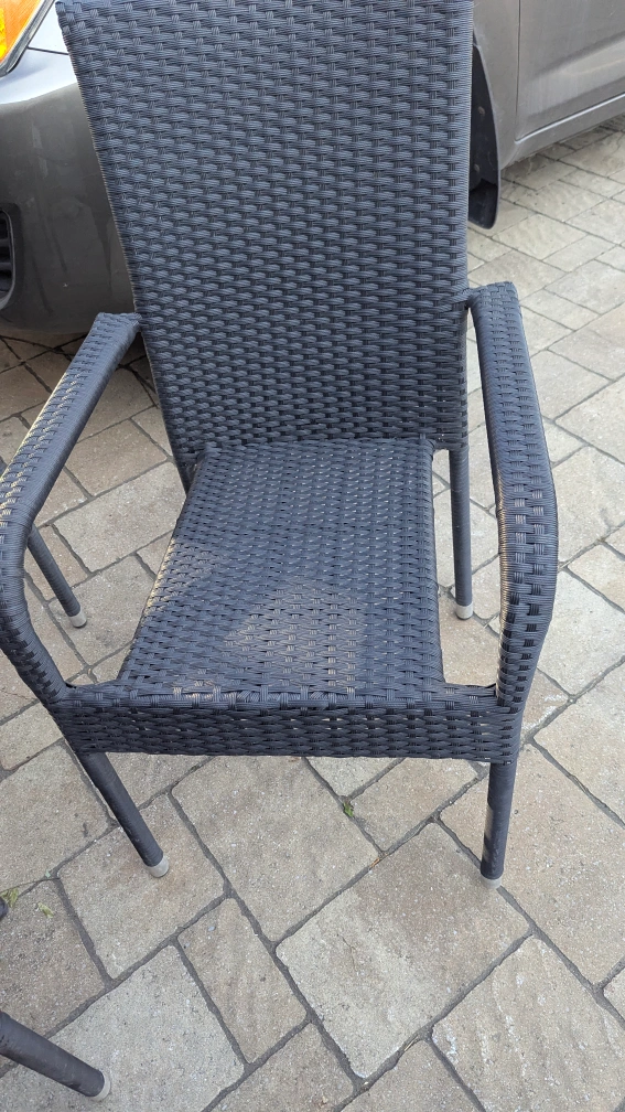 Chairs made with a woven design. The arms curve gently outwards. The legs are slim and made of metal. Place these chairs on your patio for a peaceful afternoon.