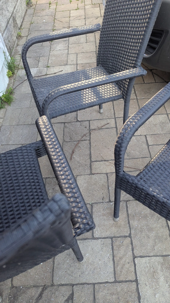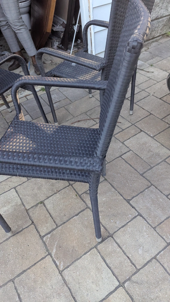 Chairs made with a woven design. The arms curve gently outwards. The legs are slim and made of metal. Place these chairs on your patio for a peaceful afternoon.