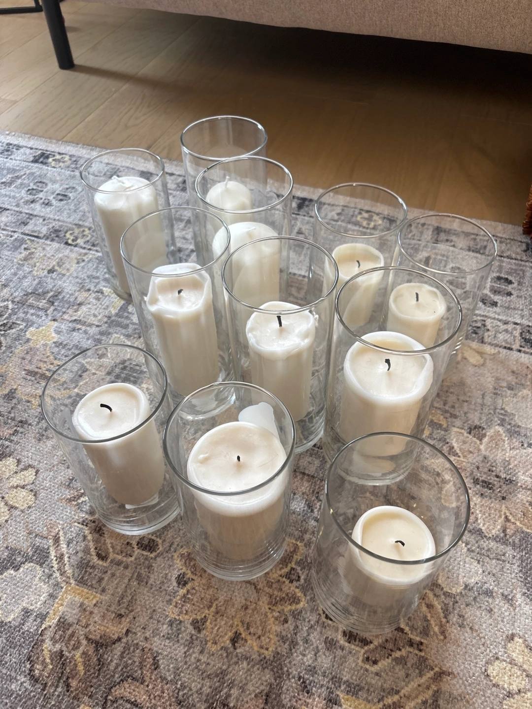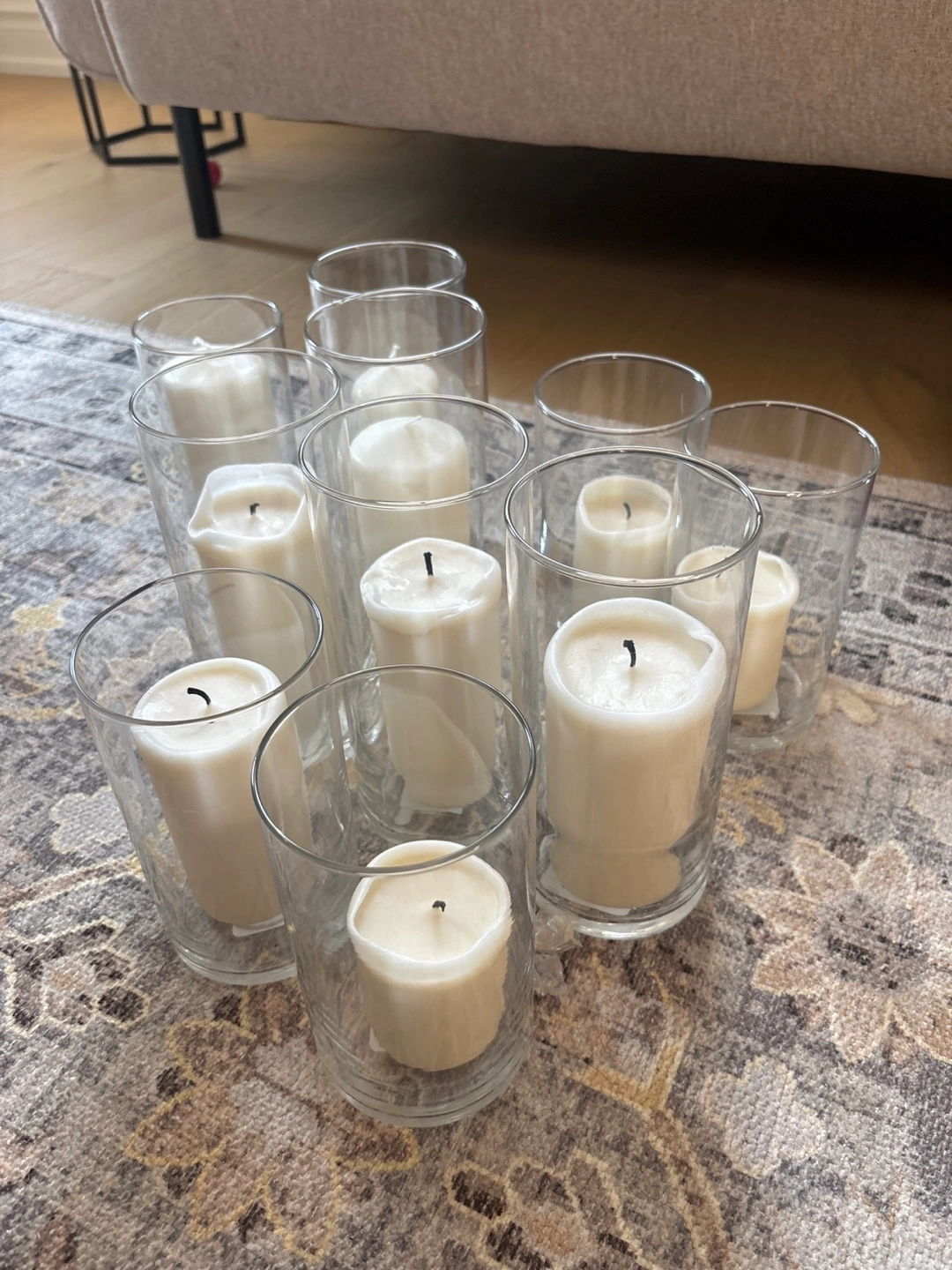 Candles in clear glass holders. Varying shapes and sizes. These candles would look great lit during a relaxing evening at home. Candles are from ikea They burn for long hours The vases from dollar tree