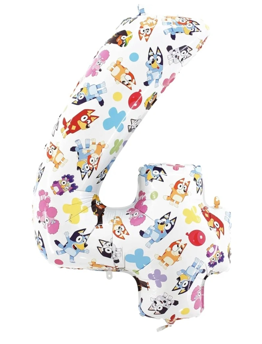 Selling a Bluey number 4 balloon for half the price I purchased it. It has the shape of the number four, with bluey characters all over.