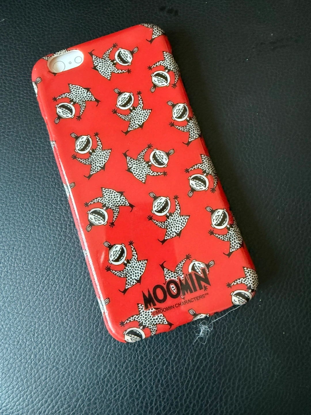 26A phone case with a Moomin design. The case features a red background. The design consists of a pattern with a Moomin character. Keep your phone safe and find peace in this fun case.