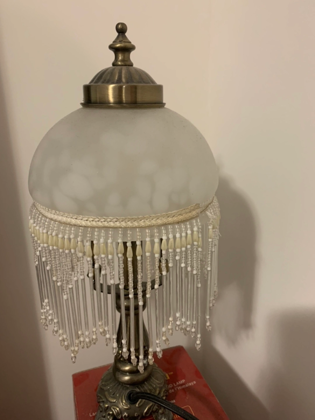 Features a frosted glass shade. Embellished with bead fringing. Antique brass finish. A lamp like this would be wonderful for bedside reading.