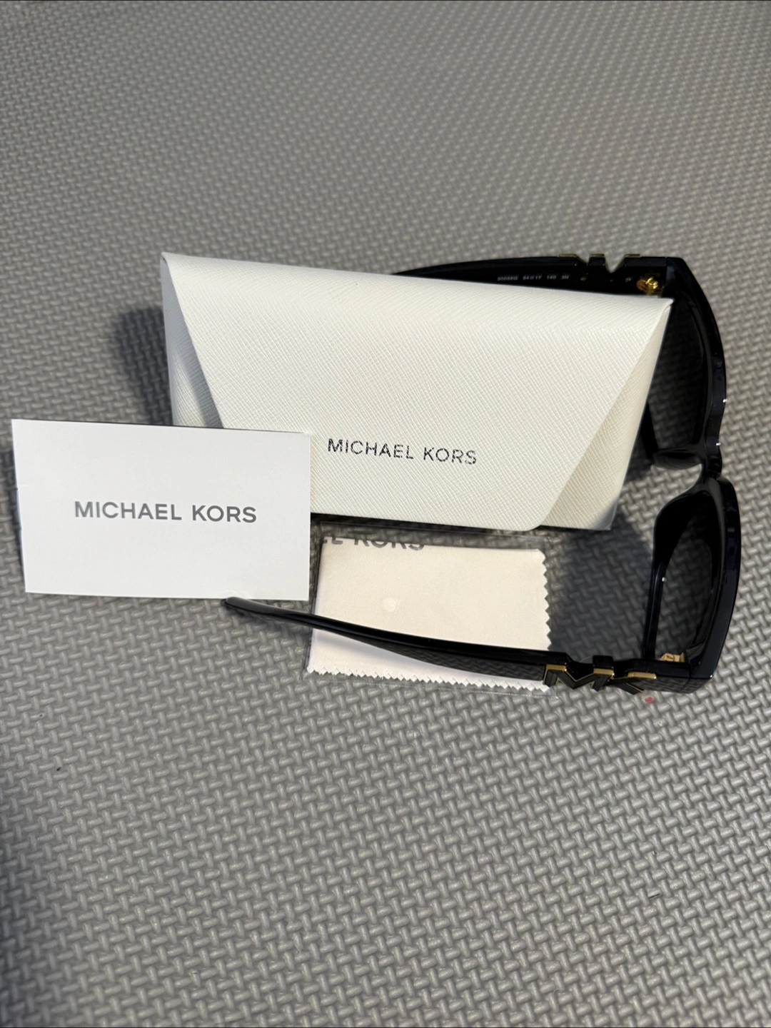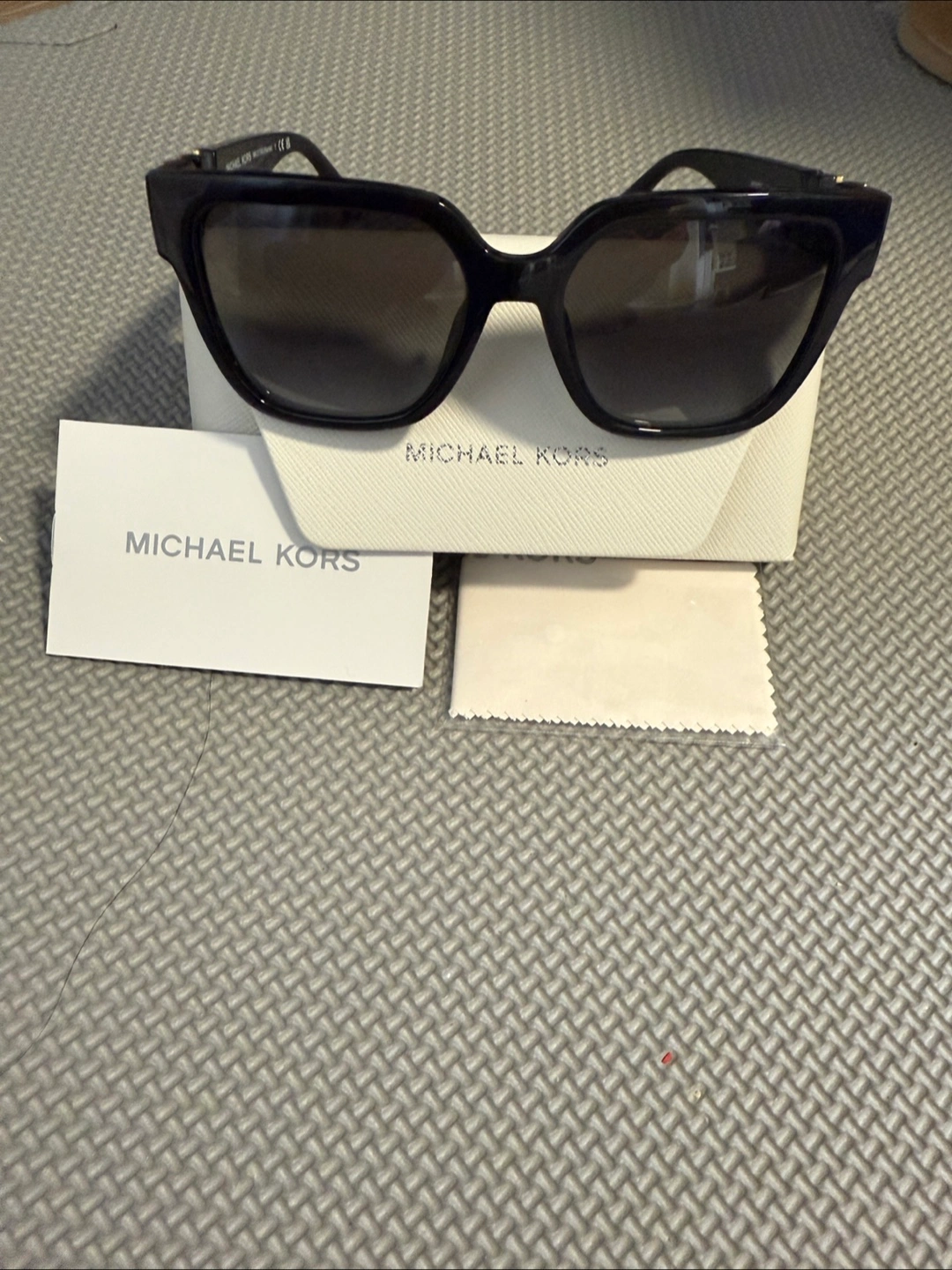 Sunglasses with dark lenses and a black frame. Comes with the original case, cleaning cloth, and paperwork. They are perfect for a sunny day stroll.