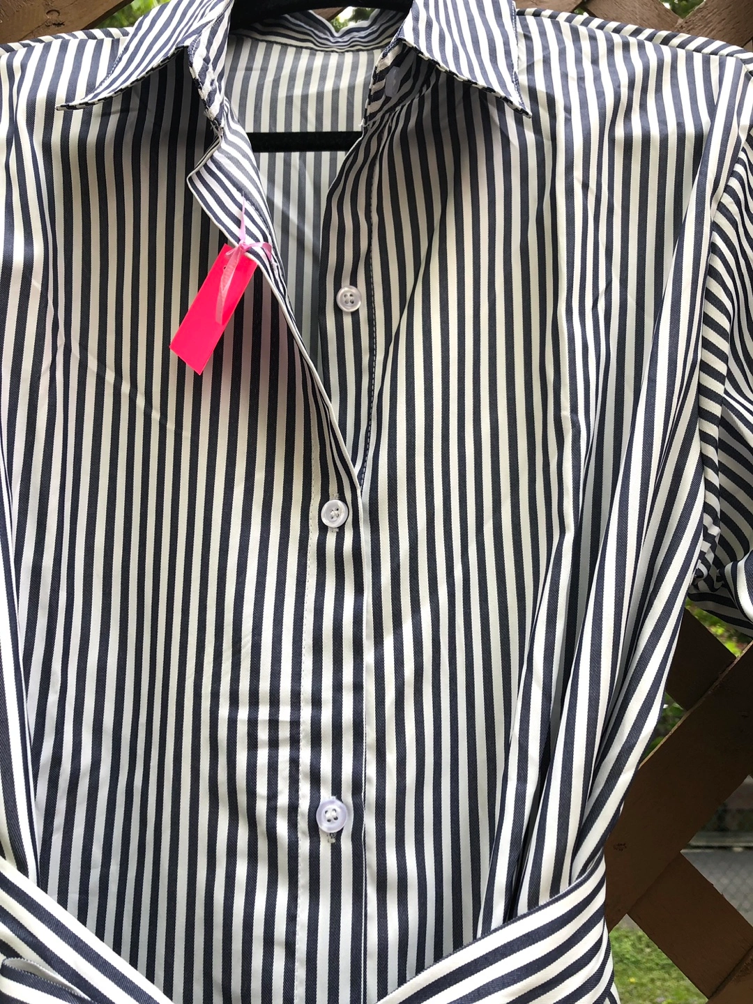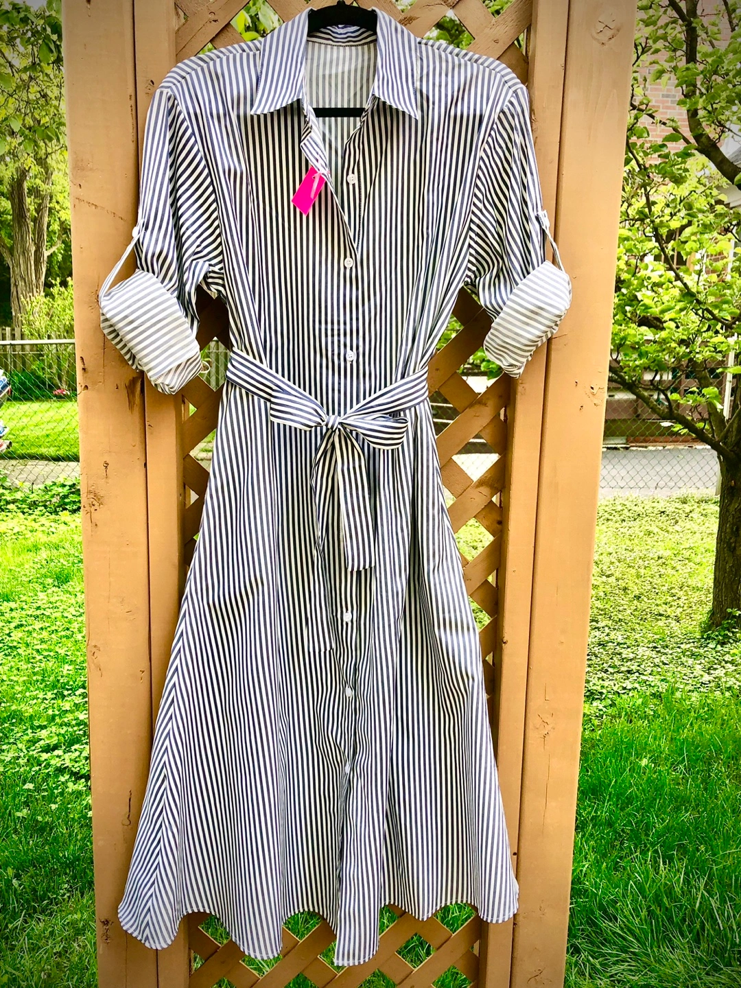 The dress has a button-up design and long sleeves. The sleeves can be rolled up and buttoned. It features a belt around the waist and is a beautiful dress for a summer day.