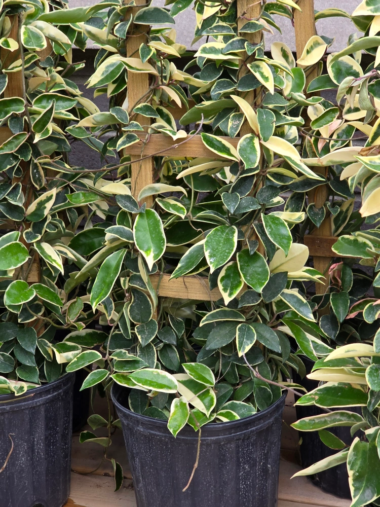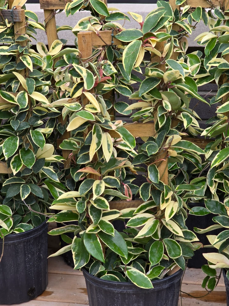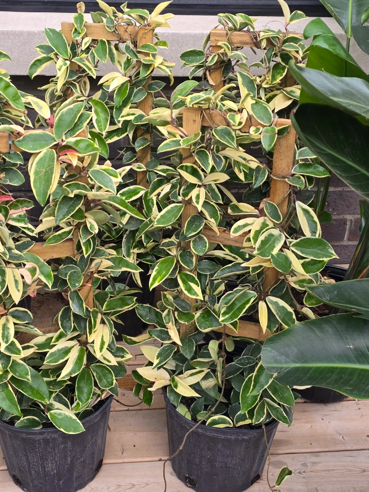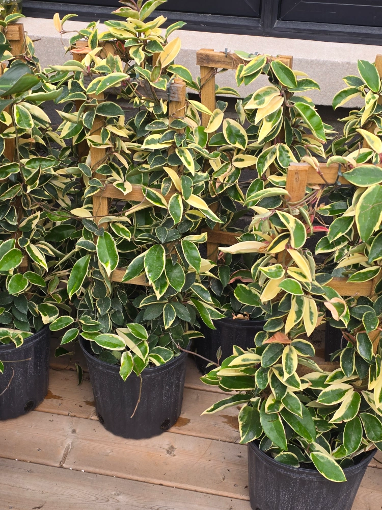 Lovely plant with green and yellow leaves. Includes wooden trellis for climbing. Comes in a black pot. You could place this plant anywhere in your house to bring some life to your space.