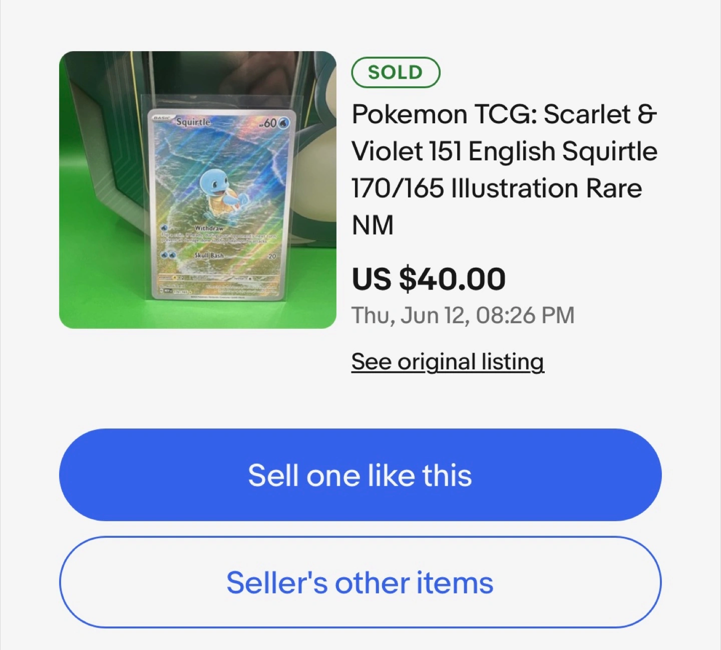 Buy & SellSquirtle (Pokemon 151) IR 170/165Squirtle (Pokemon 151) IR 170/165$55Opened by me, pack fresh Squirtle asking for $55 obo Recently sold on eBay for $40USD (55CAD)ConditionNewWHERE TO MEETCheck LocationView MapSELLERverifiedMiyaHigh Park Swansea26212 reviews0 chats·1 favorites·47 views