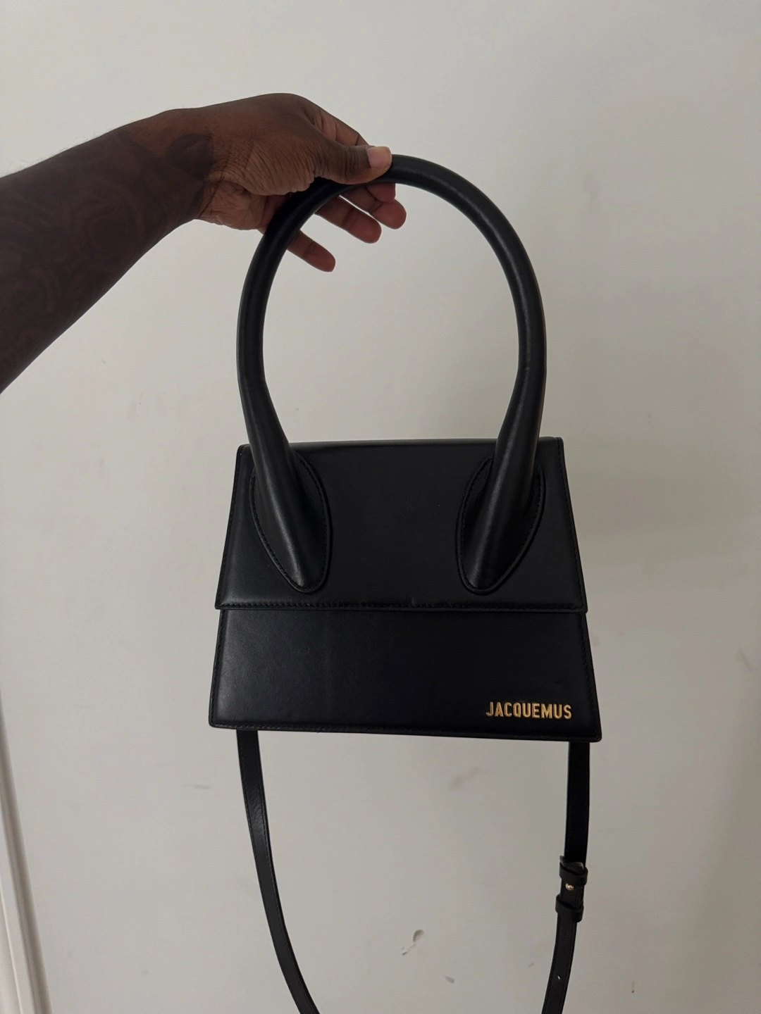 Elegant black handbag, in a structured shape. Featuring a top handle, with a detachable strap. A great bag to take out for a relaxing day.