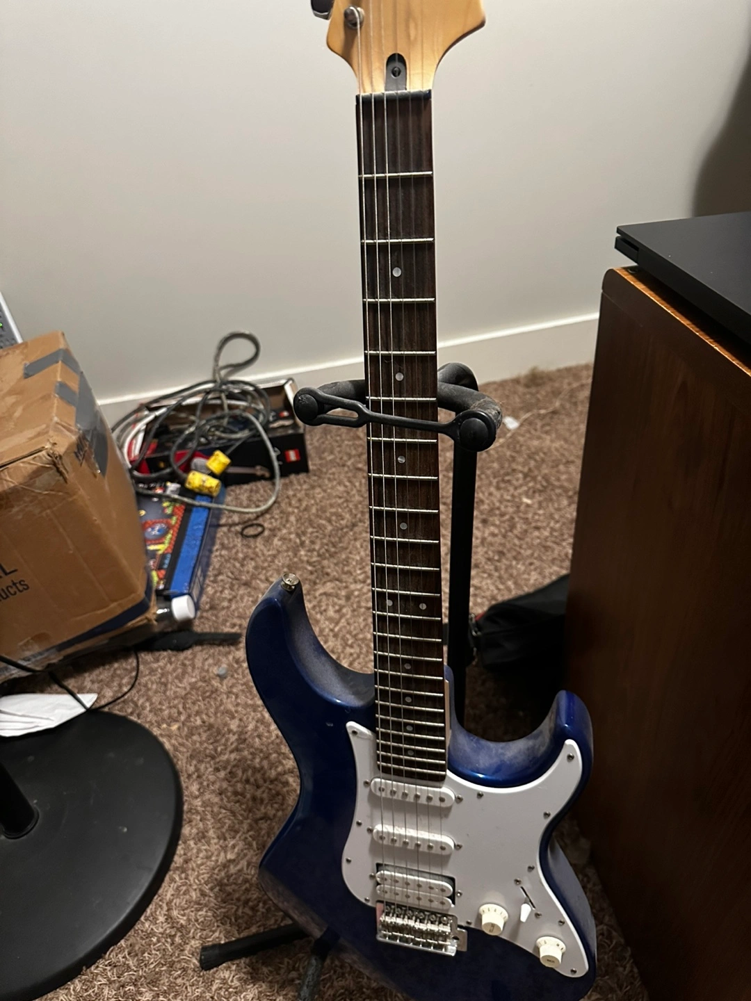 Selling a combo set of amp and electric guitar. The amp has various dials. The guitar is blue and white with a stand, perfect for learning. You can practice your favourite songs anytime you feel like it.