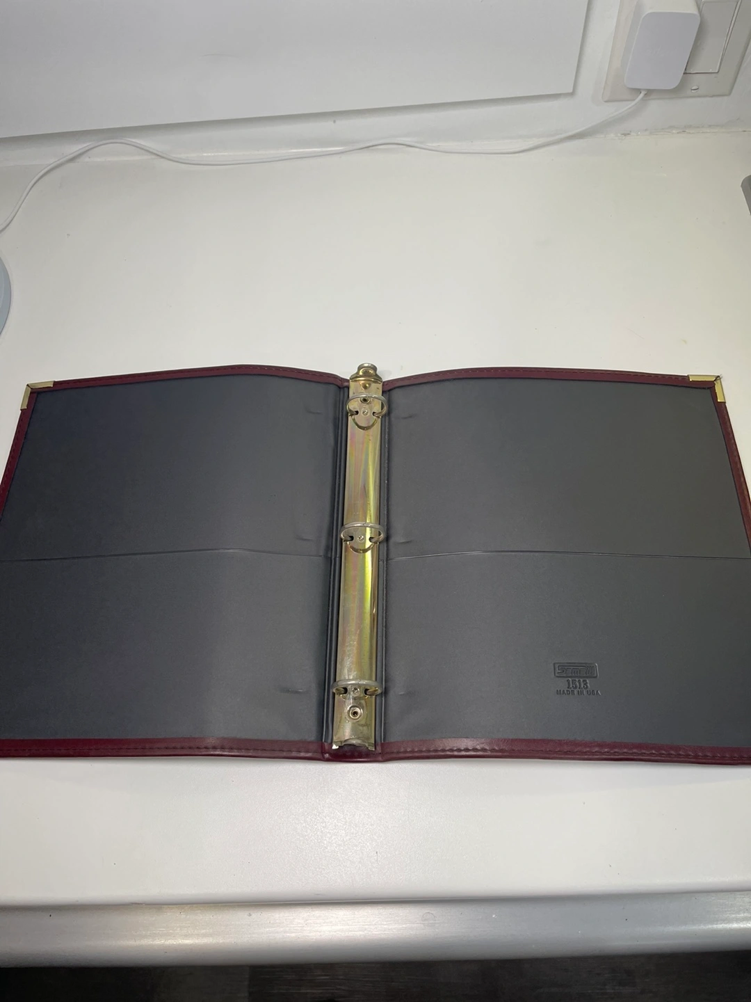 278A binder featuring a burgundy cover with golden corner accents. Inside, there's a three-ring binder mechanism and pockets. The cover has a smooth texture, and the spine has visible stitching. It is perfect for organizing your thoughts and plans and keeping important documents.